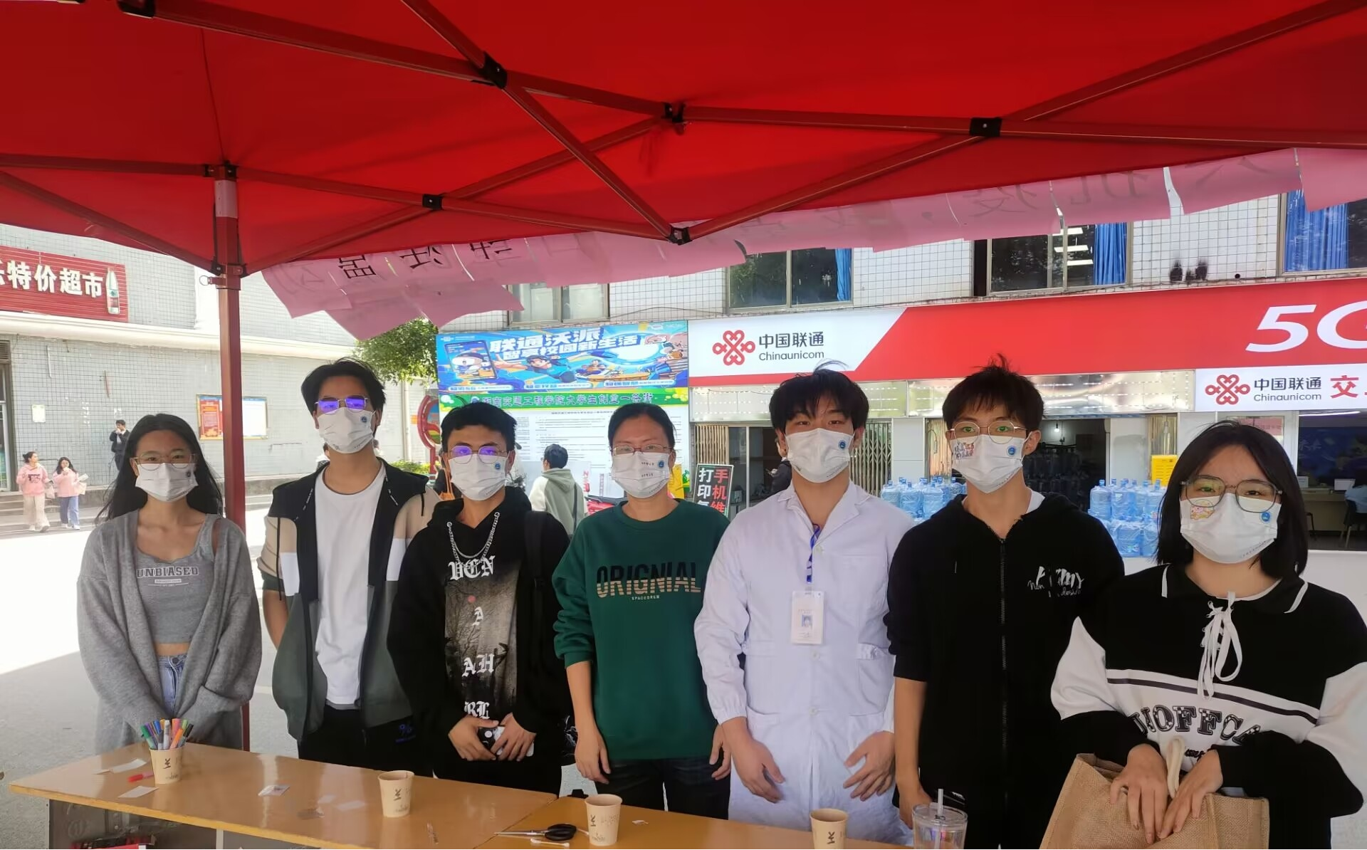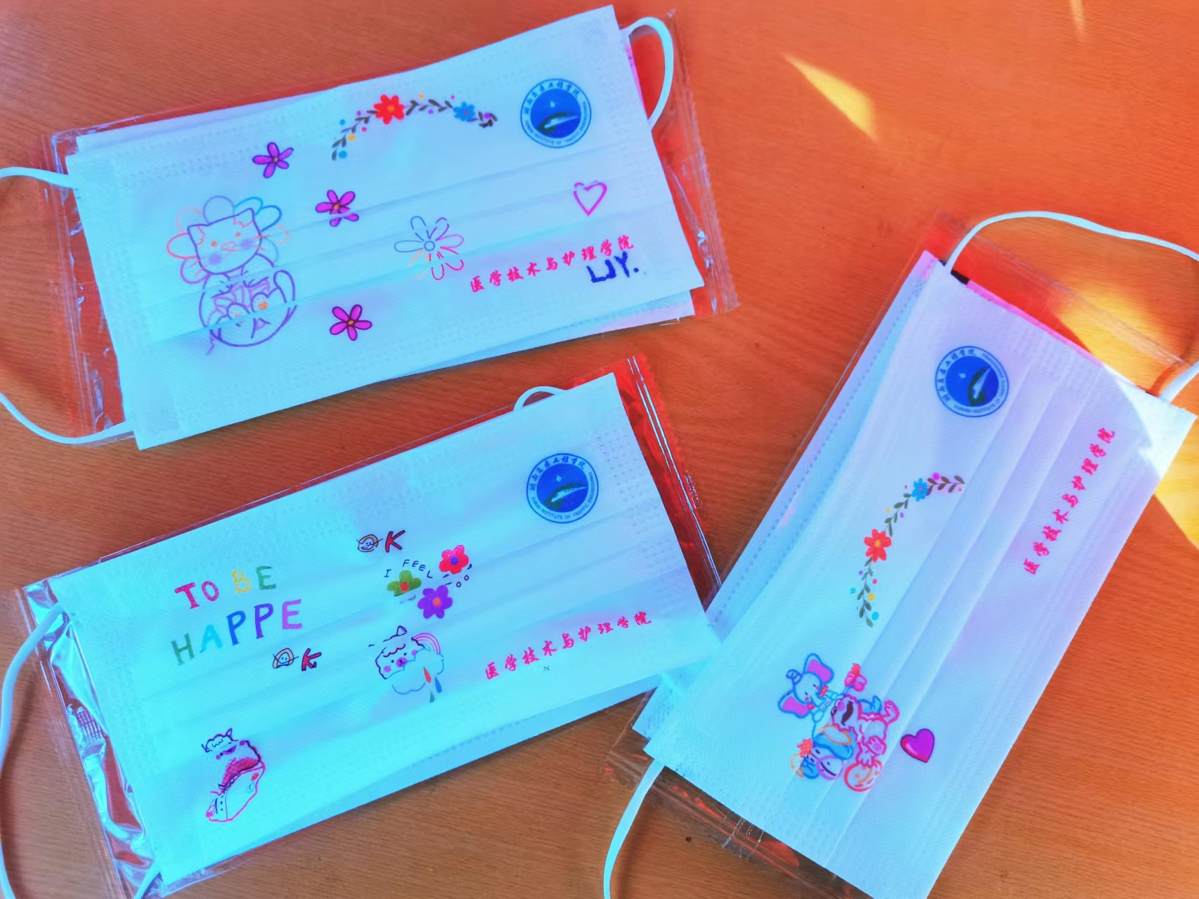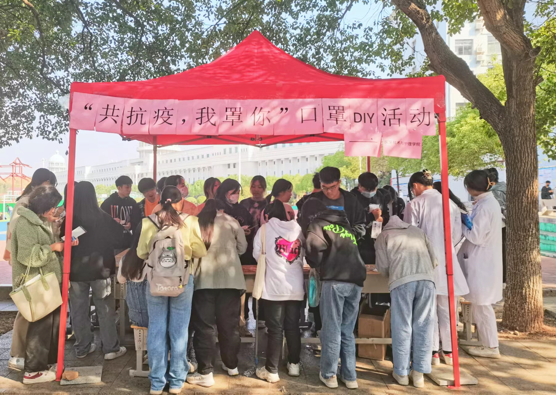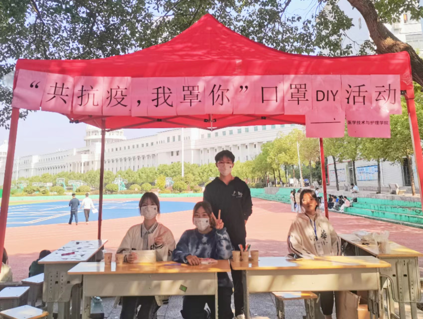 为了响应疫情防控的号召,医学技术与护理学院于11月9日在足球场旁边举办了“共抗疫,我罩你”口罩DIY活动。其目的是提醒学生戴好口罩,将戴口罩视为防控常态化工作。