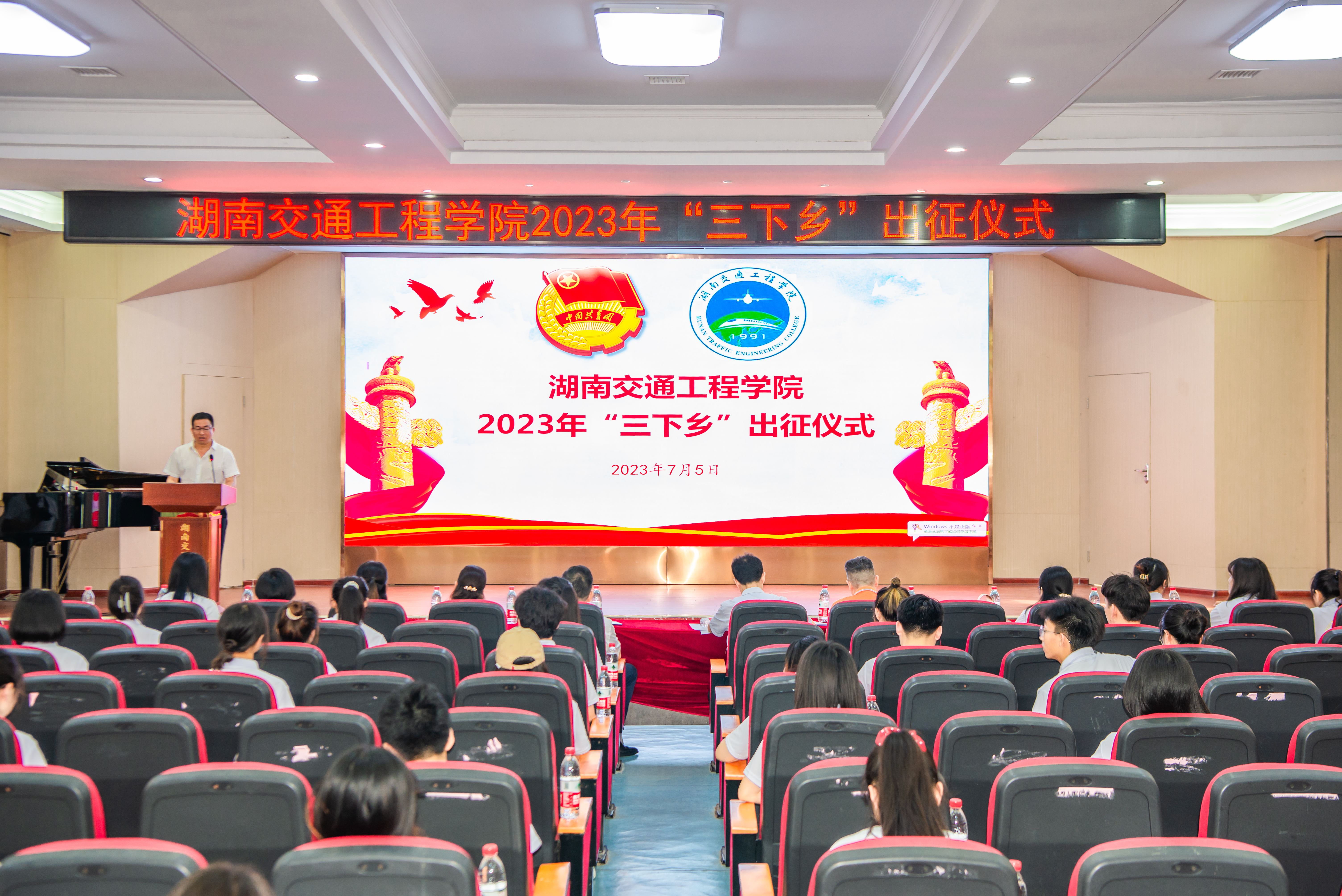 本网讯(记者 赵红深 摄影 李建华 奉隆源)7月5日上午,best365官网在航母楼101举行2023年大学生暑期“三下乡”社会实践活动出征仪式,为即将走进基层学知识、走近群众长见识、走向一线作贡献的志愿者们壮行。党委书记刘文君、副校长余孟辉出席,学校相关职能部门负责人,各二级学院团总支书记、指导教师代表、社会实践队员150余人参加出征仪式。出征仪式由校团委漆在林主持。