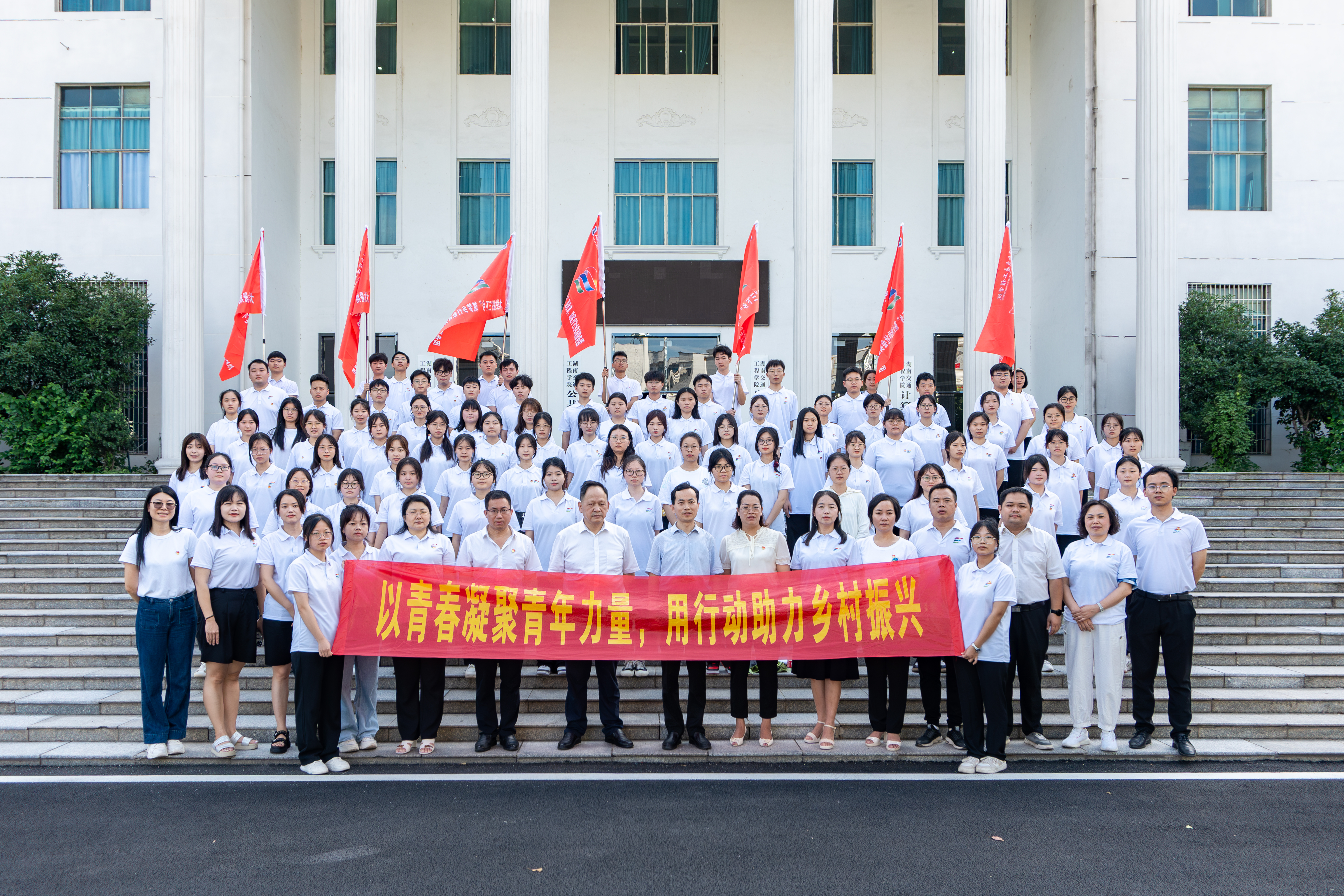 接着,全体领导和志愿者同学们移步学校综合实验实训大楼前隆重举行三下乡出征仪式。