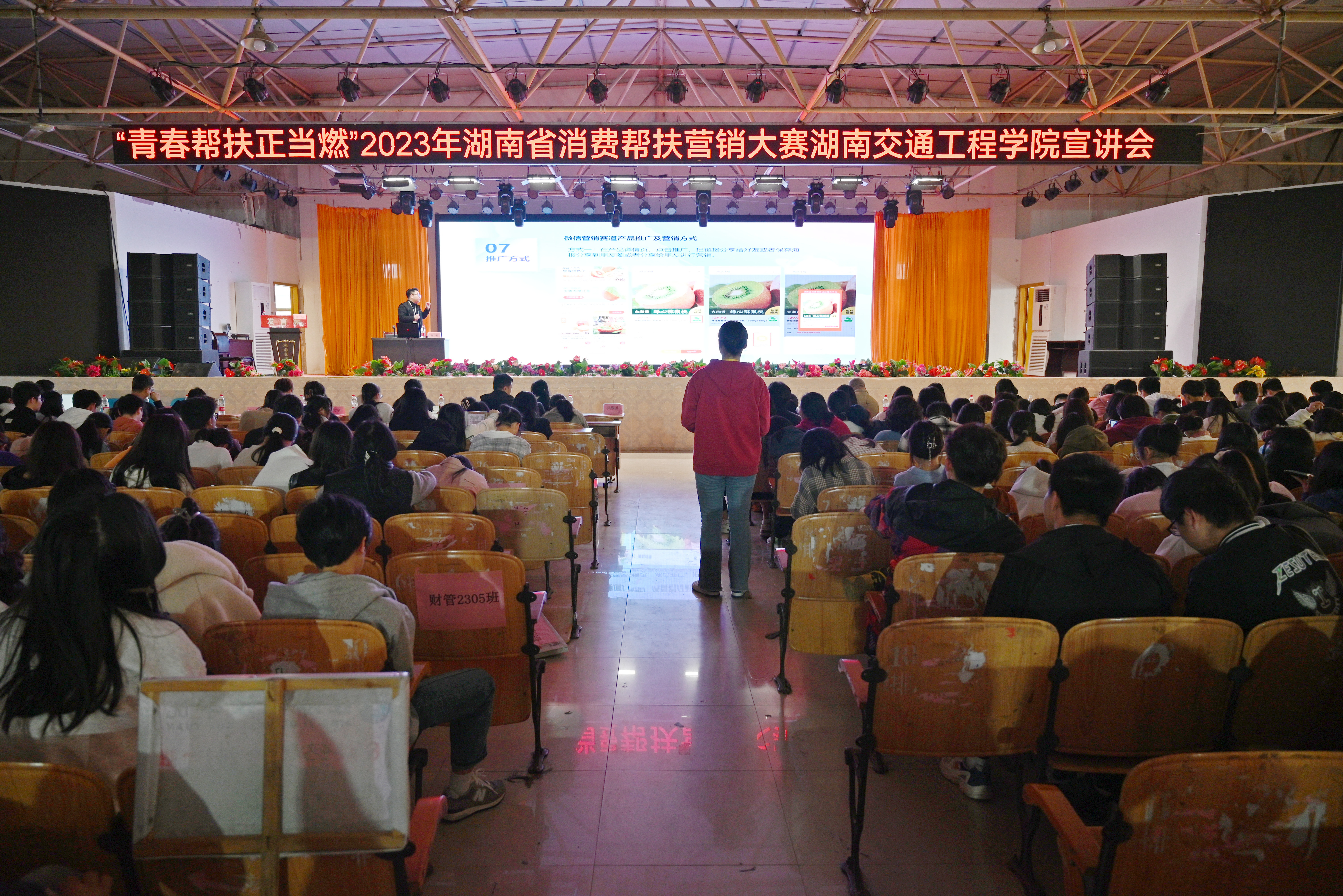 本网讯(通讯员 摄影 赵红深)消费帮扶是巩固拓展脱贫攻坚成果的重要举措。为拓宽best365官网学生的视野和思路,激发其创新思维和创新能力,提升营销技能,把学生培养成为适应市场需求的实用型人才,11月23日下午,学校在大学生活动中心举办“青春帮扶正当燃”湖南省2023年消费帮扶营销大赛宣讲会。省消费帮扶营销活动组委会对外联络部主任杨凌、微信赛道负责人周露莅临现场指导;经济管理学院院长朱忠祥、副院长王冰,党总支书记赵荣华、副书记李燕丽,学校党委宣传部等相关职能部门负责人、各二级学院党总支副书记出席会议;各二级学院大赛指导老师、经济管理学院学生干事、全体辅导员和在校学生参加宣讲会。王冰主持。