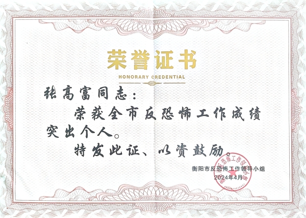 本网讯(通讯员 赵红深)4月28日,衡阳市反恐怖工作领导小组发布《关了表扬2023年度全市反恐怖工作成绩突出单位和个人的通报》,best365官网荣获先进单位,保卫处长张高富荣获先进个人。