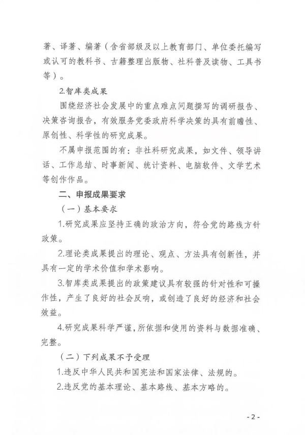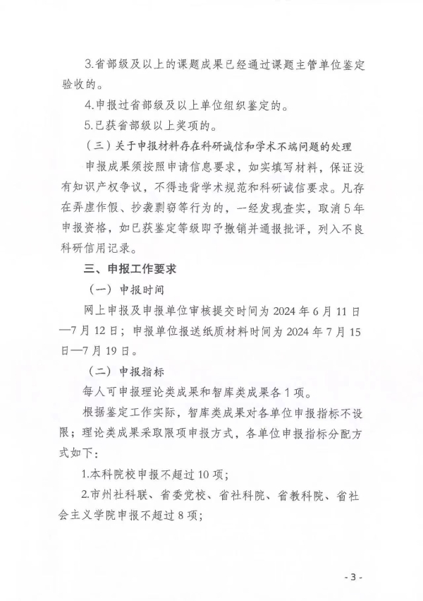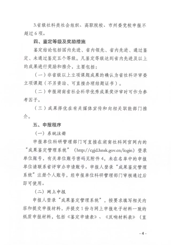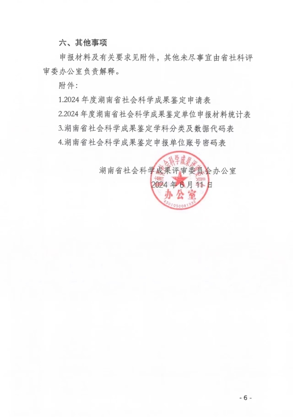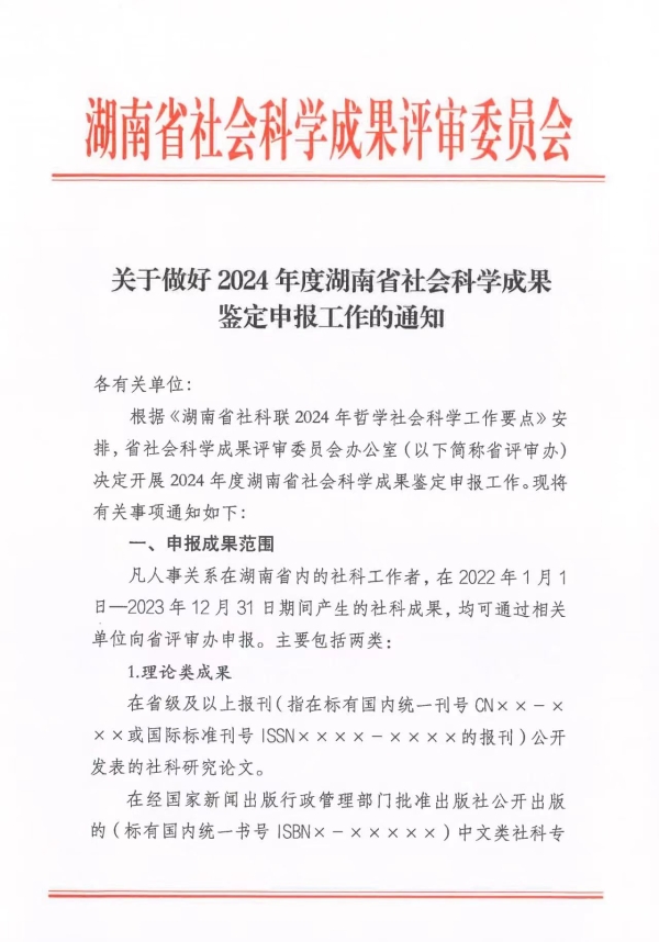 转发:关于做好2024年度湖南省社会科学成果鉴定申报工作的通知 来源: STB 发布时间:2024-06-13 浏览次数:[7428] 次 附件: 2024年度湖南省社会科学成果鉴定申请表.doc 2024年度湖南省社会科学成果鉴定单位申报材料统计表.xls 湖南省社会科学成果鉴定学科分类及数据代码表.doc 【打印正文】 上一篇: 转发:关于申报2024年度衡阳市指导性计划项目的通知 下一篇: 关于组织申报2024年度衡阳市知识产权专项项目的通知
