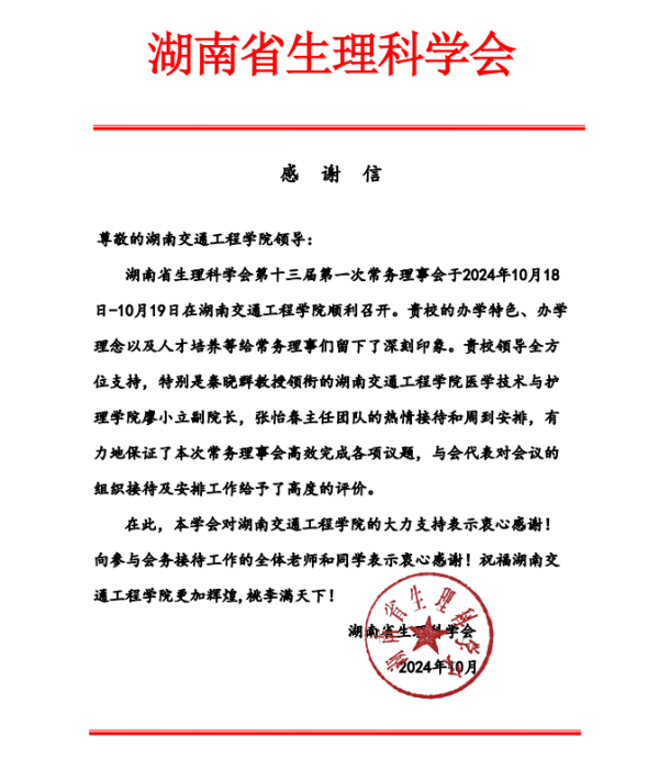 湖南省生理学会对best365官网的承办工作给予了高度评价。学会在感谢信中表示,best365中国官方网站以其卓越的组织能力、专业的服务水平和热情的接待态度,为常务理事会的成功举办做出了巨大贡献。