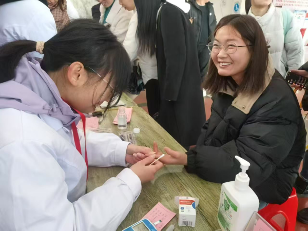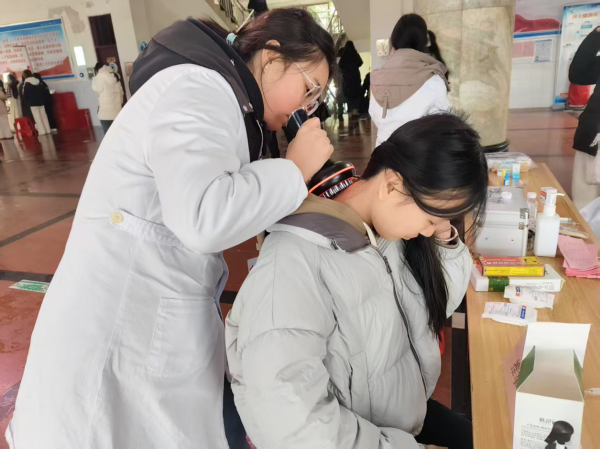 志愿者们早早抵达现场,有序地布置场地,为义诊做好准备工作。随着下课铃声响起,教学楼大厅渐渐热闹起来,来往的师生们被义诊活动和志愿者们热情的招呼所吸引,纷纷驻足参与。在义诊现场,志愿者们充分展现出专业素养和奉献精神。他们耐心地引导师生们进行各项检查,有条不紊地为大家测量血压、检测视力、检查色盲及色弱。此外,还提供了推拿按摩、艾灸等中医特色服务。面对来往师生们的咨询,志愿者们总是耐心倾听,并根据每个人的身体状态提出实用的健康小常识和科学合理的建议,看着来往的师生们一张张笑脸,义诊活动的温暖一定传递到了他们的心里。