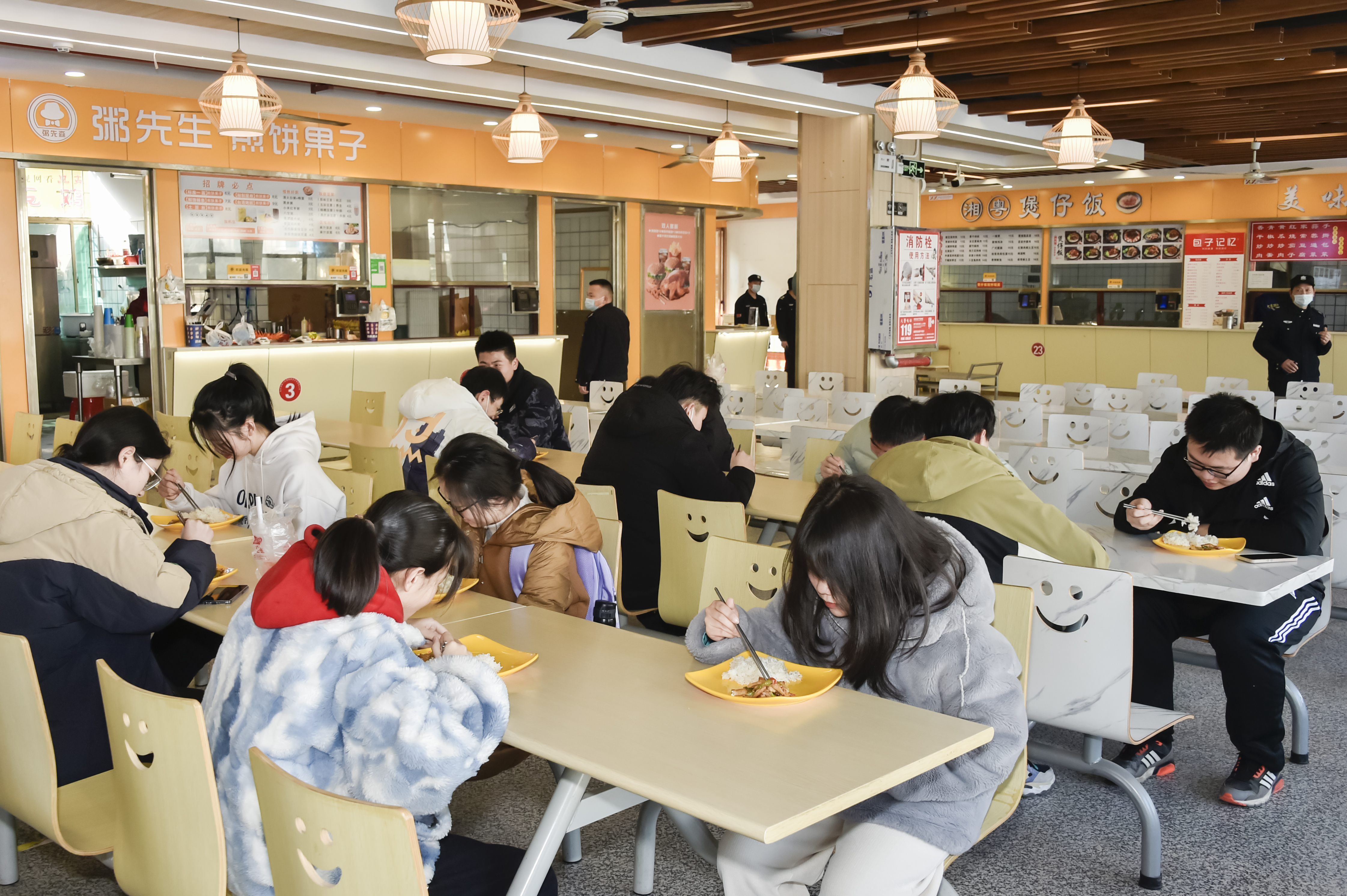 场景三一食堂:食品安全委员会巡查员以发现正在就餐的A学生精神不佳,并偶有干咳、流鼻涕等症状为背景,模拟了立即报告应急救治处置组,处置组立即将A同学带到隔离区,校医在隔离区再次进行体温确认后,报告指挥长并转市属医院。指挥长带领秩序保卫组立即进入食堂就餐厅,稳定餐厅秩序,同时做好就餐厅其他学生的心理安抚,做好食堂就餐庁的通风工作,并应急救治处置组将现场就餐学生引导至学校隔离观察室,消毒组立即对食堂就餐厅进行全面消毒。