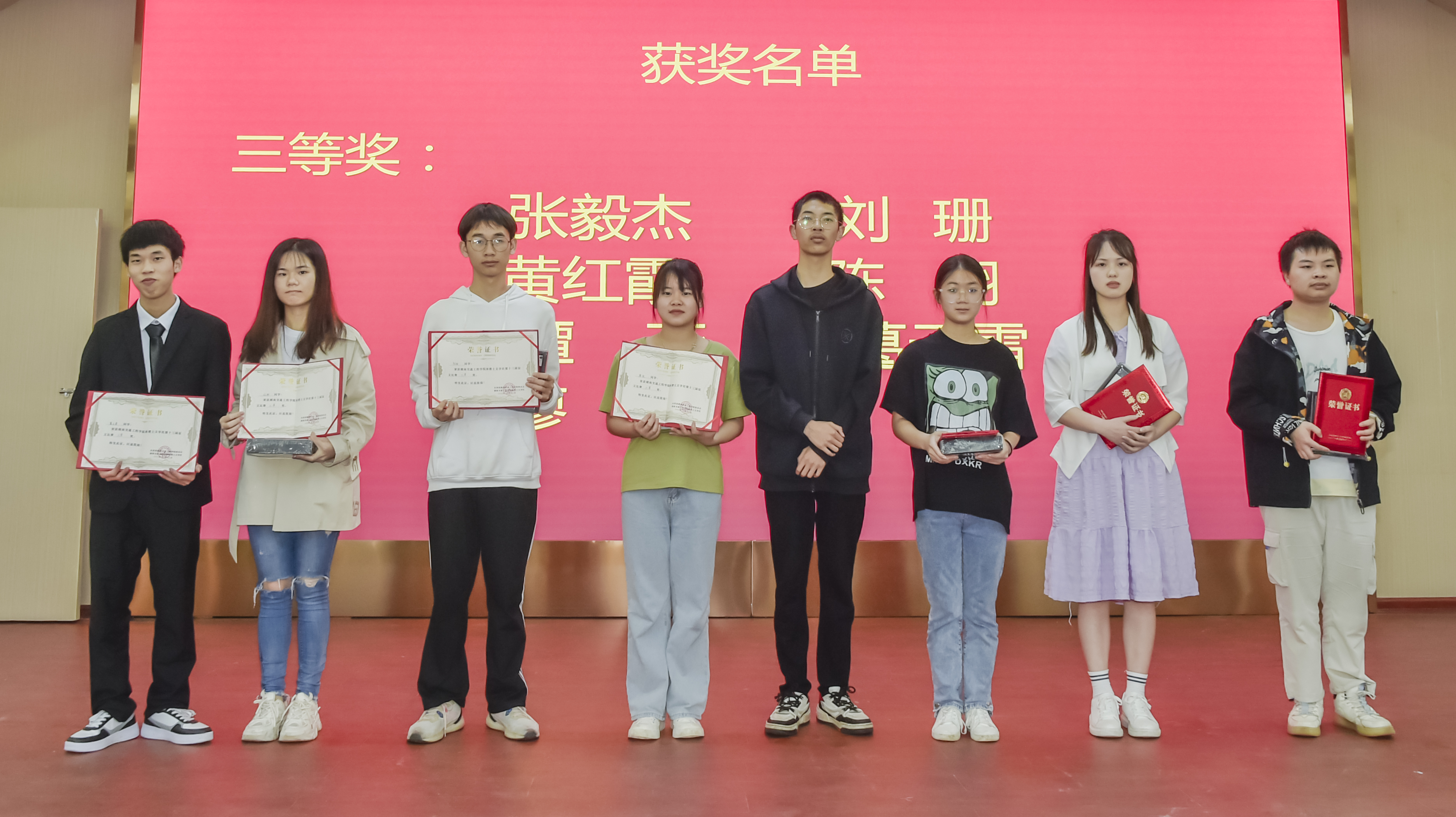 党委宣传部部长赵红深宣读获奖名单:经济管理学院唐芝贤获特等奖;人文与艺术学院干子豪、李媚和经济管理学院刘盼雨等3人获一等奖;人文与艺术学院张晓芳、黎姿、赵妮,经济管理学院陈蕊和护理学院欧朝芳等5人获二等奖;人文与艺术学院谭燕,经济管理学院张毅杰、黄红霞,护理学院刘珊、葛云雷和机电工程学院廖俊等7人获三等奖。邓丽老师获优秀指导老师奖。