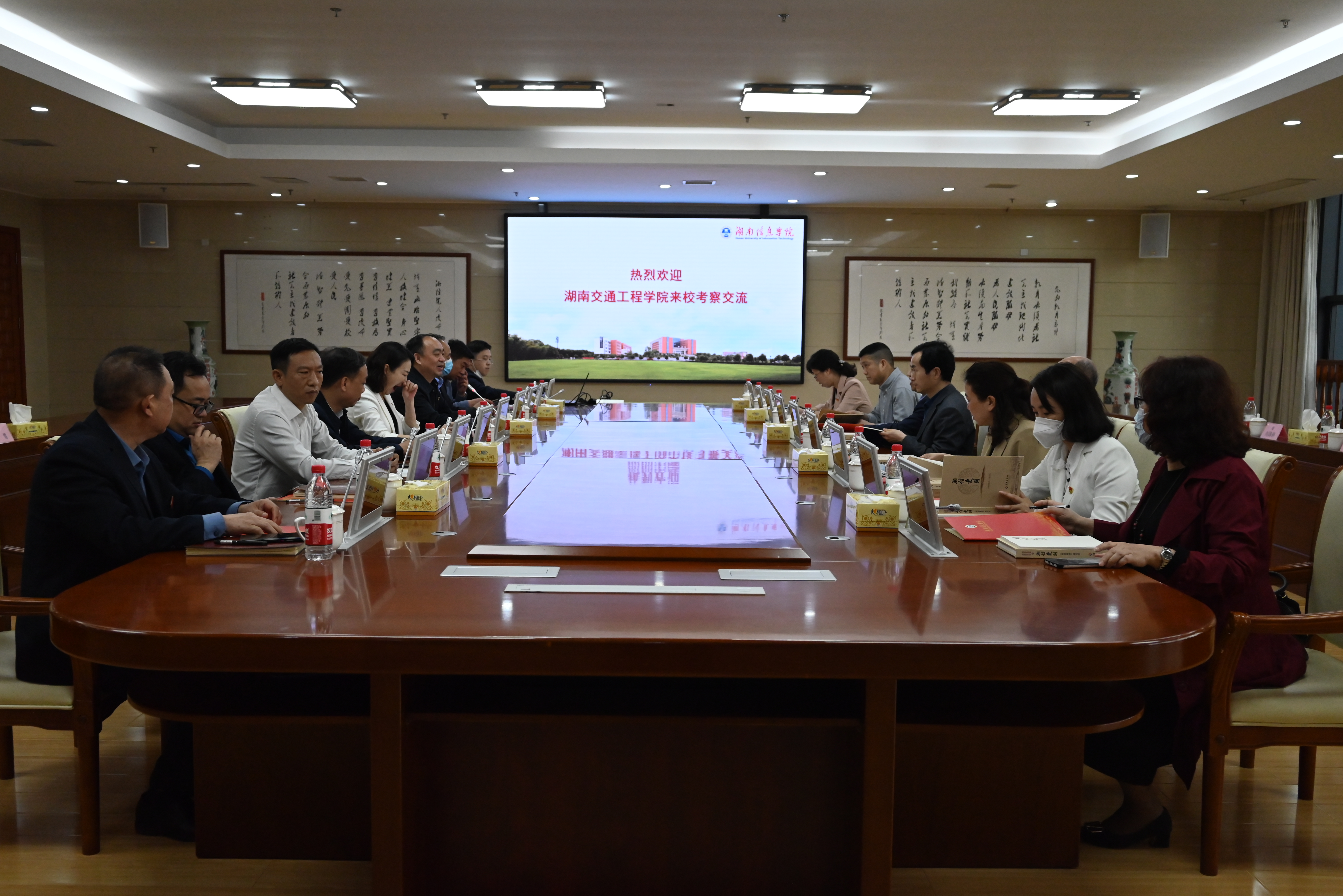本网讯 3月14日,党委书记刘文君率学校党委班子及党政办、宣传部、后勤处、团委等部门负责人赴湖南信息学院参观学习。湖南信息学院党委书记喻玲娜、副书记姜佐澧, 纪委书记、副校长刘龙刚, 副校长尹开源等校领导及对口部门负责人热情接待, 董事长陈登斌会见。