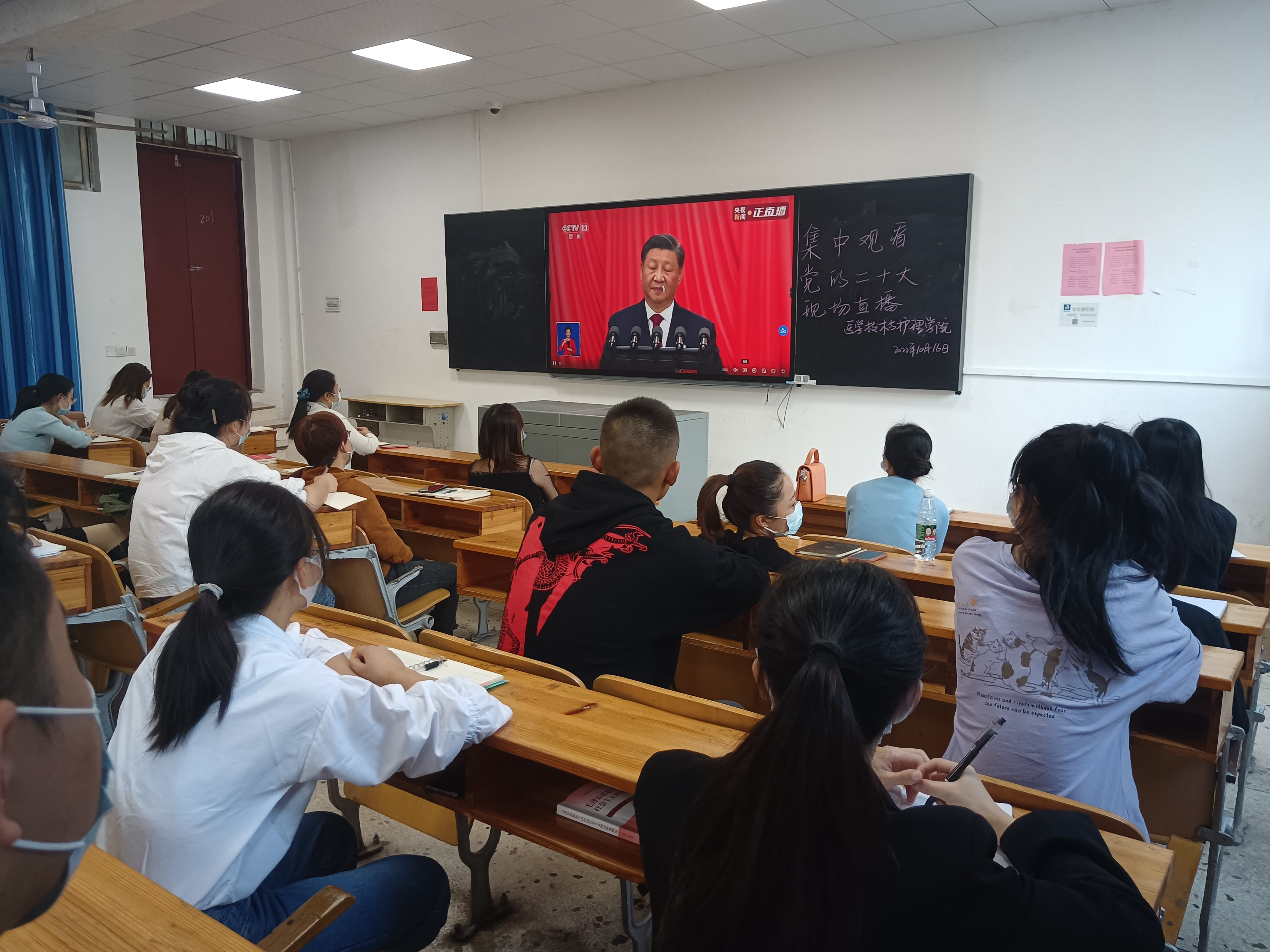 10月16日上午十时,医学技术与护理学院组织全体教师党员、在校学生党员、入党积极分子、学生代表共145人,在教学楼201、203两个教室集中观看中国共产党第二十次全国代表大会开幕式。