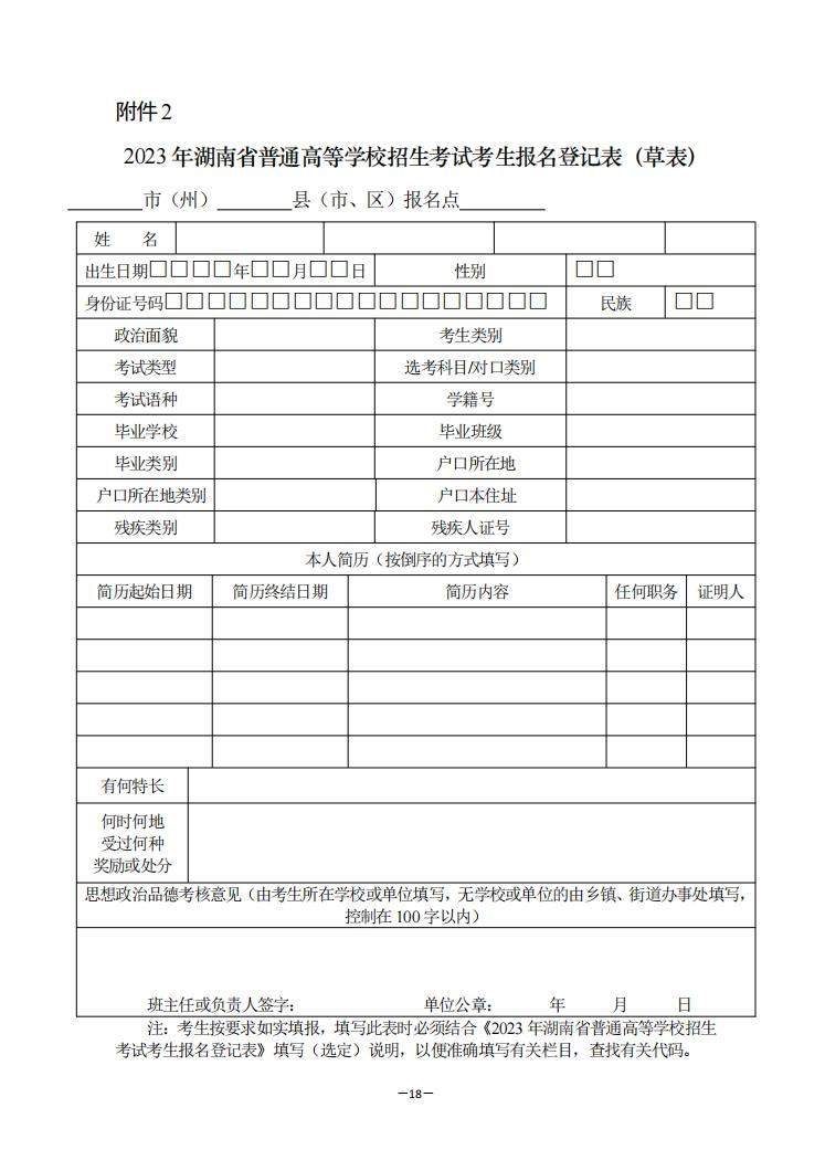 2.2023年湖南省普通高等学校招生考试考生报名登记表(草表)(点击下载)