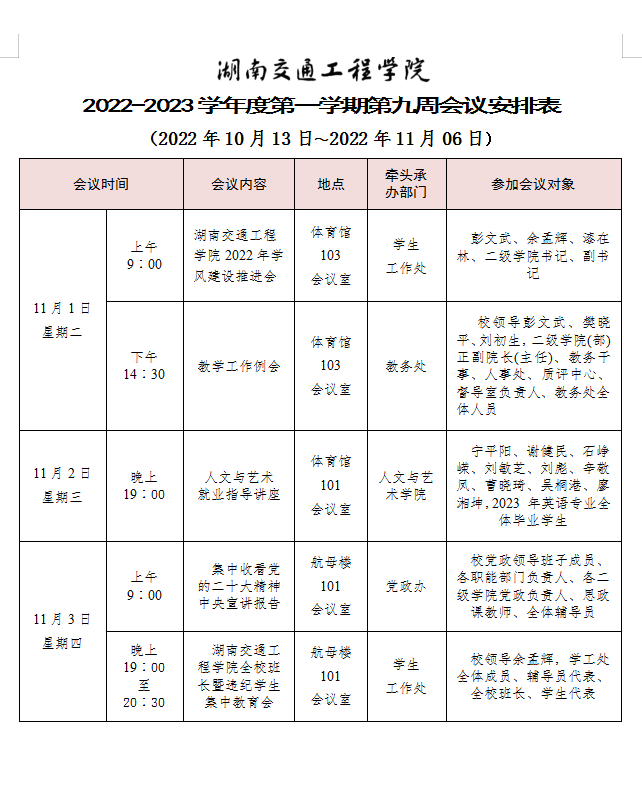 best365中国官方网站2022-2023学年度第一学期第九周会议安排表