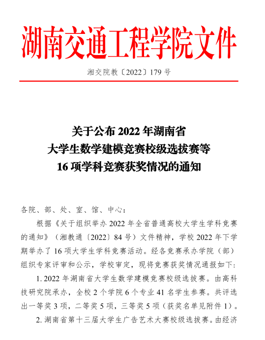 关于公布 2022 年湖南省 大学生数学建模竞赛校级选拔赛等 16 项学科竞赛获奖情况的通知