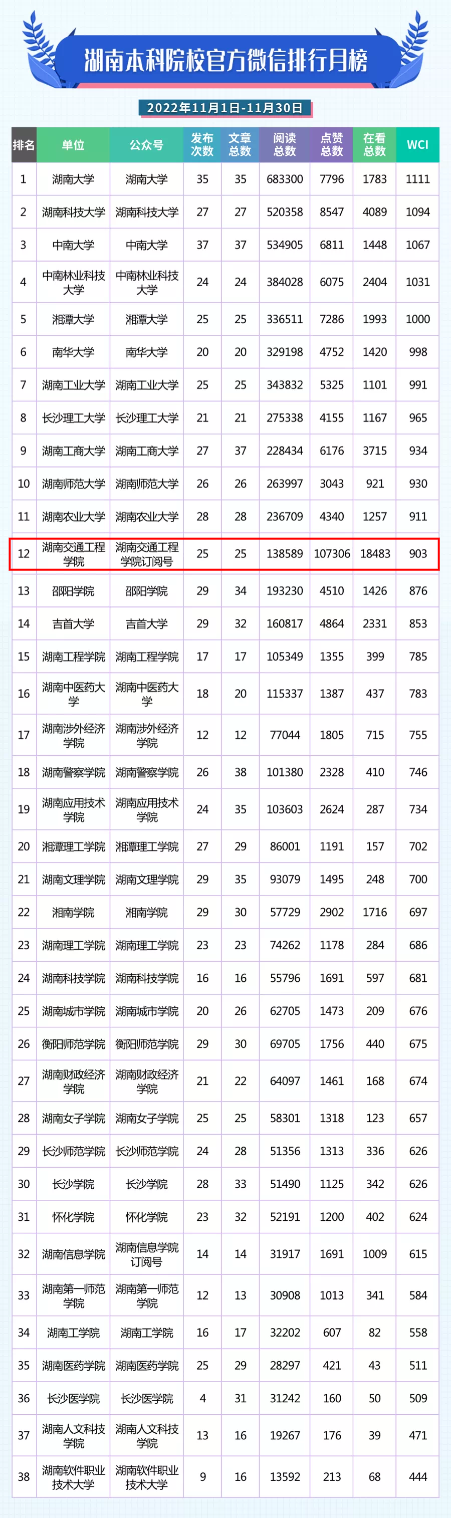 本网讯(通讯员  赵红深 刚刚获悉,11月湖南教育政务微信排行榜出炉,best365官网官方微信订阅号11月份传播力和影响力持续提升。其中,发布次数25,推文总数25;文章阅读总数138589(10月79526),相比10月增加74.27%;点赞总数107306(10月55098),相比10月增加94.75%,排全省38所本科高校第1;在看总数18483(10月17254),相比10月增加7.12%,排全省38所本科高校第1;带动帐号WCI值首次提升至903(10月792),排全省38所本科高校第12,全省7所民办本科高校第1