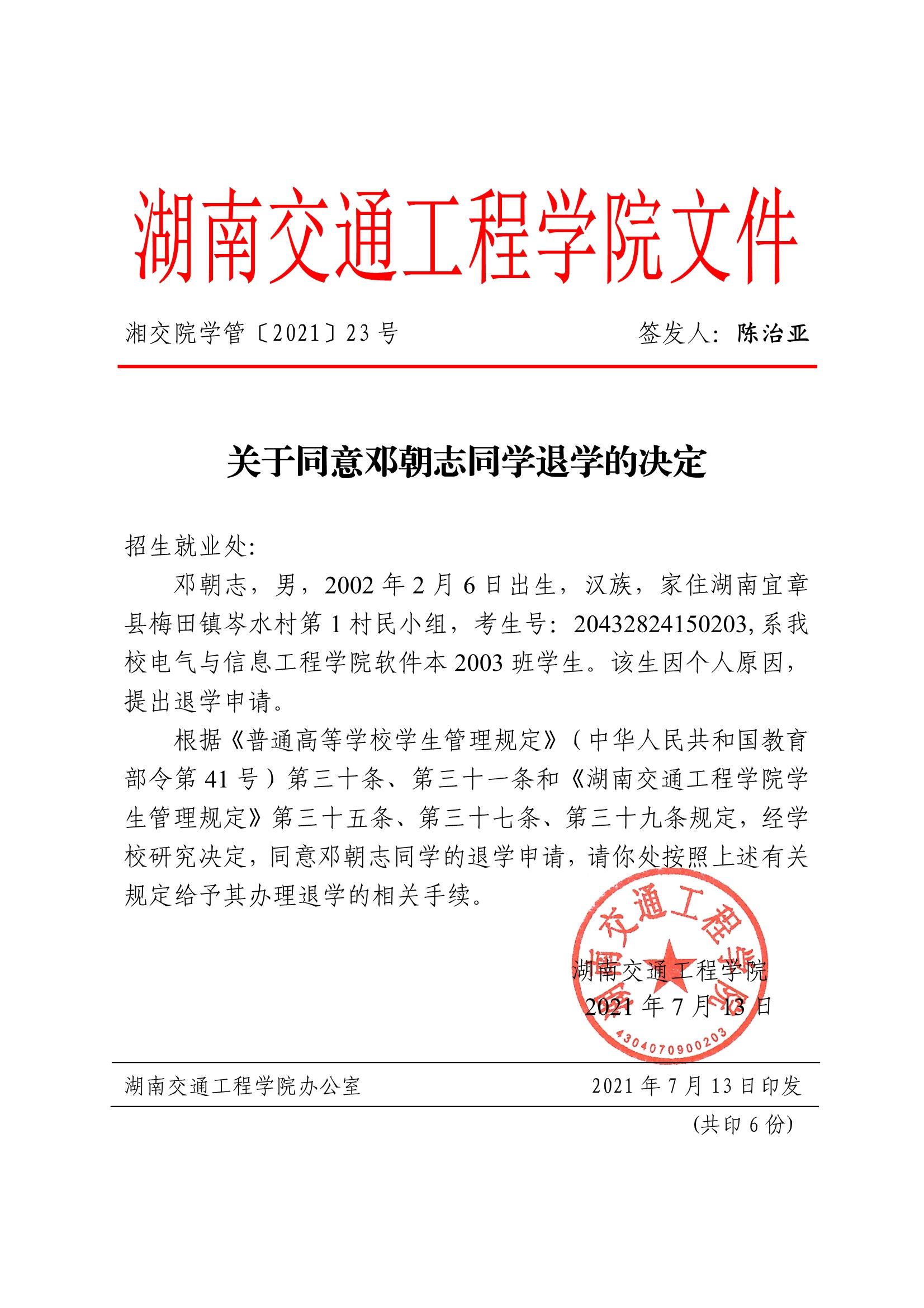 关于同意邓朝志同学退学的决定(湘交院学管〔2021〕23号)