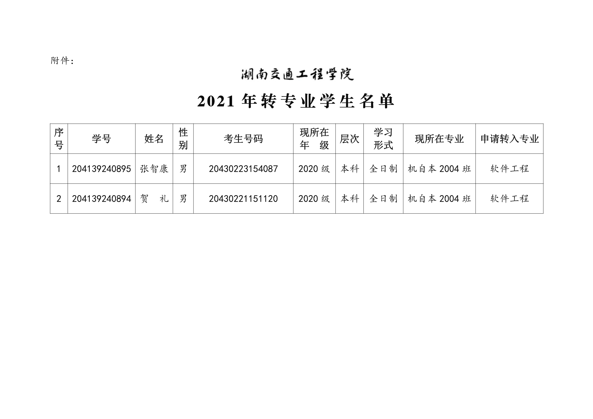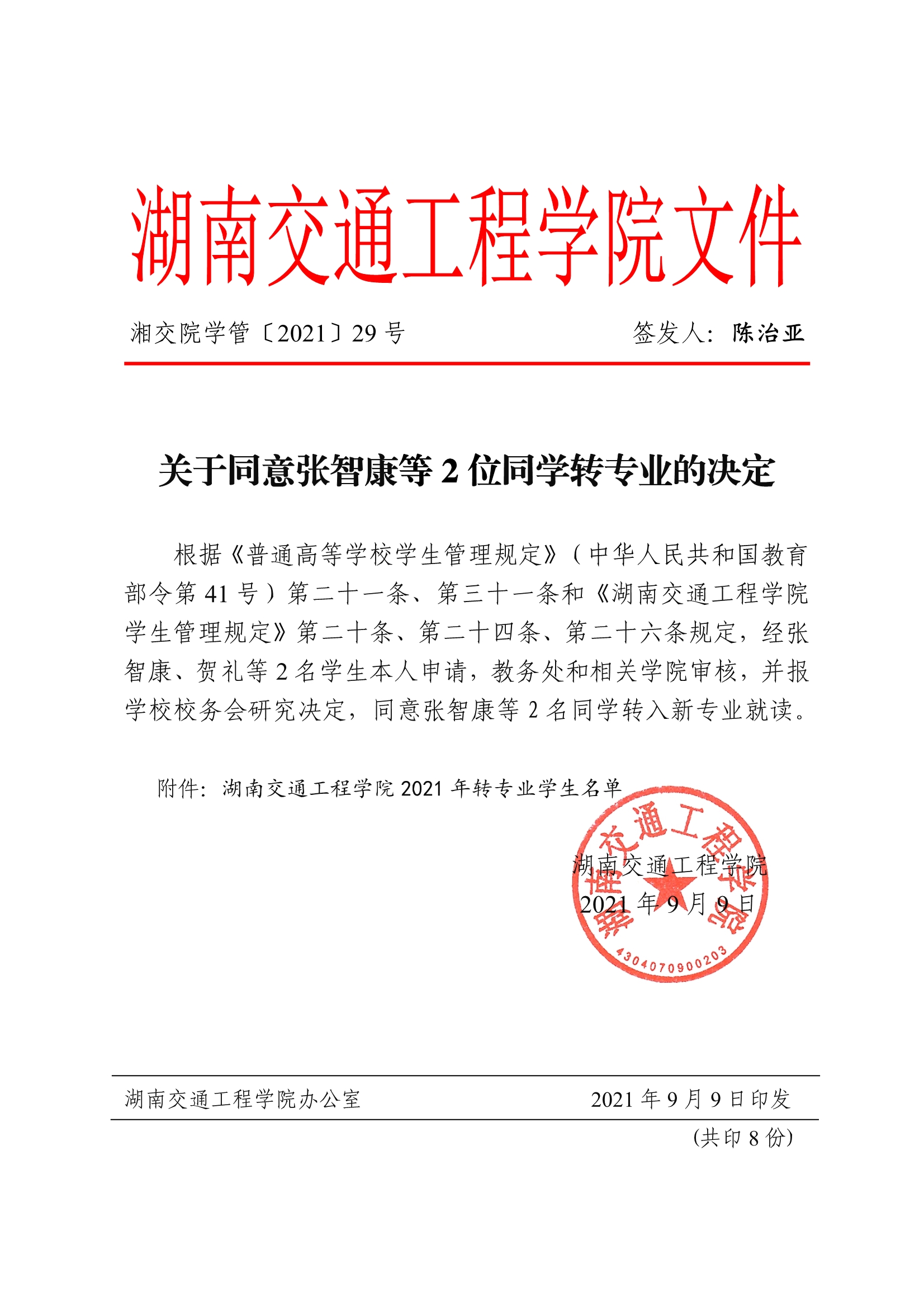 关于同意张智康等2位同学转专业的决定(湘交院学管〔2021〕29号)