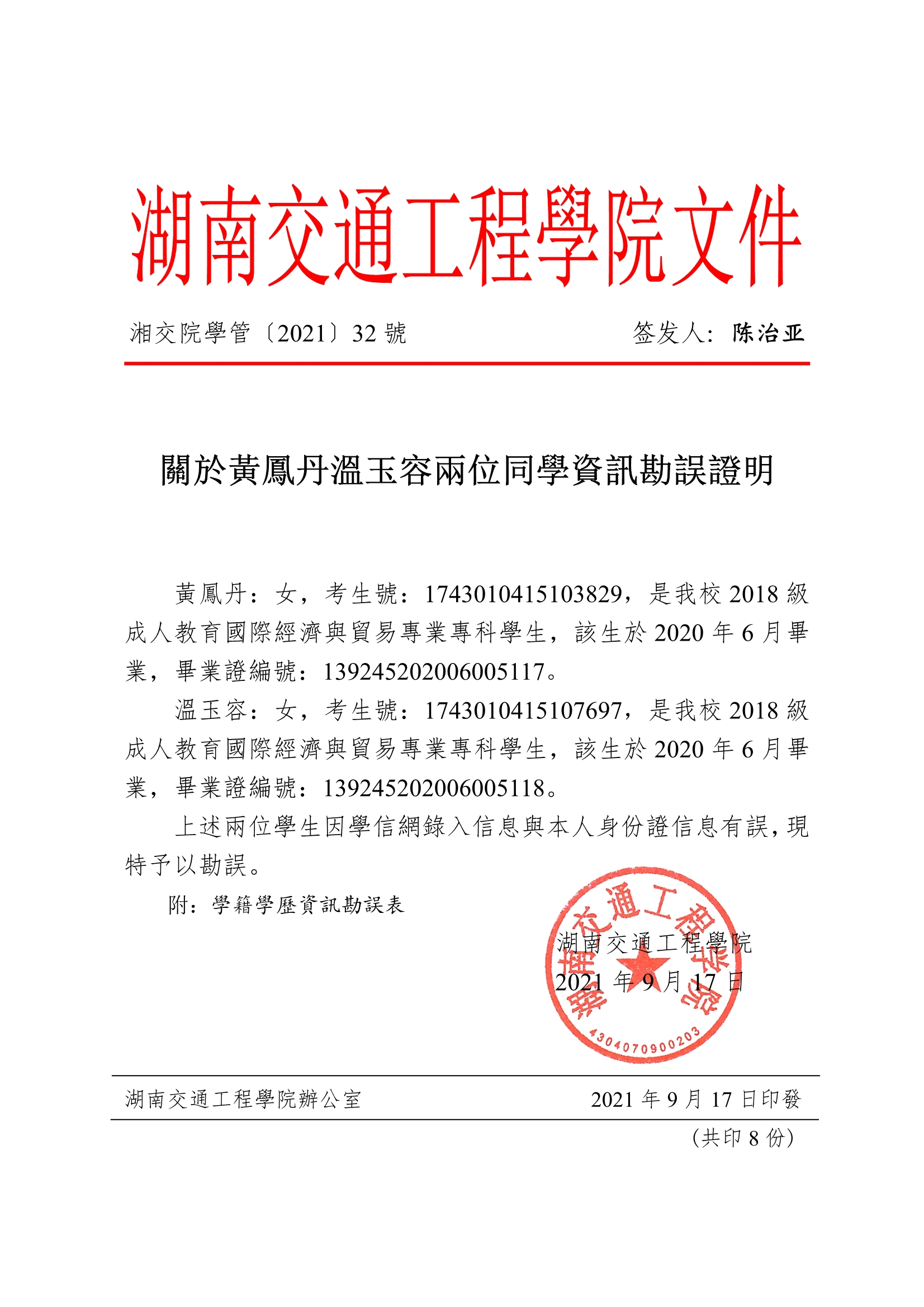 关于黃鳳丹温玉容两位同学信息勘误证明(湘交院学管〔2021〕32号)