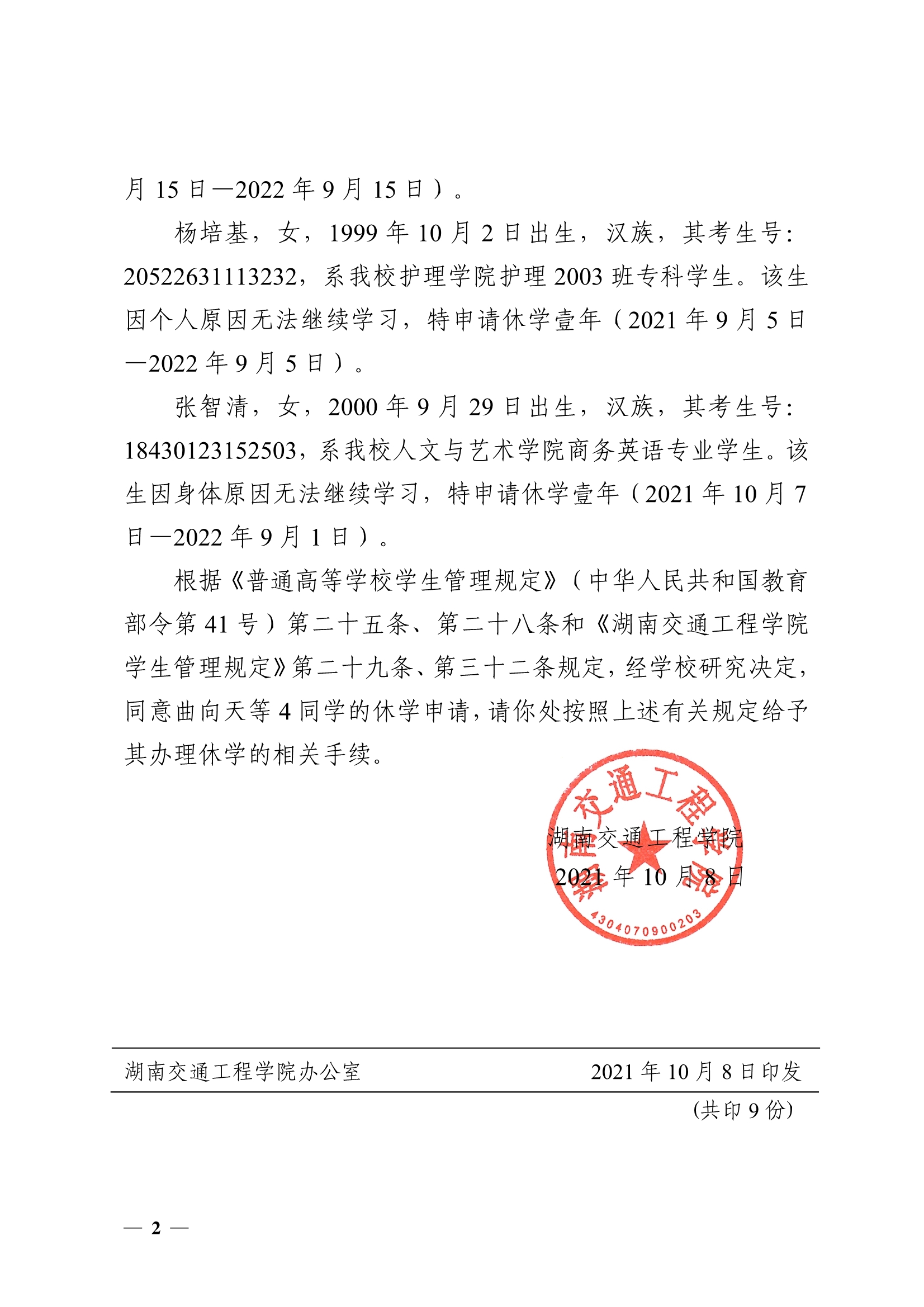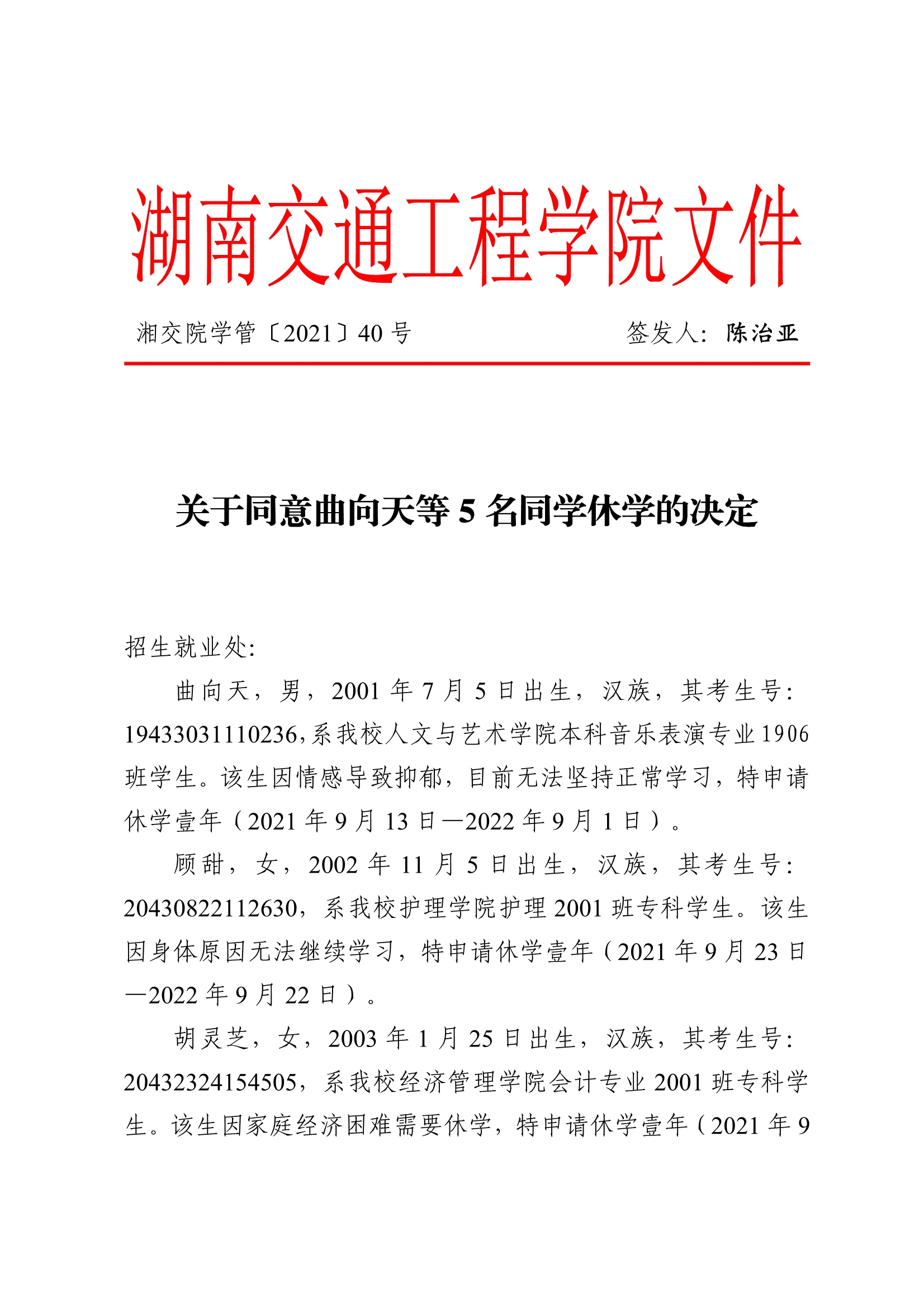 关于同意曲向天等5名同学休学的决定(湘交院学管〔2021〕40号)