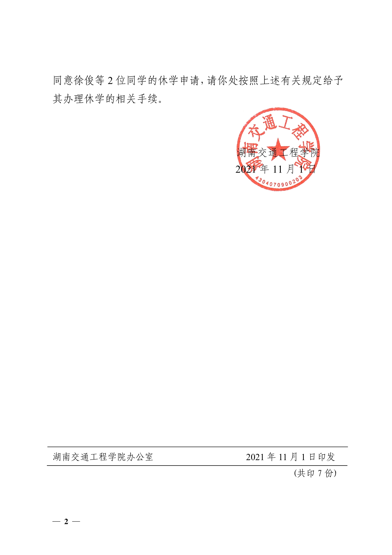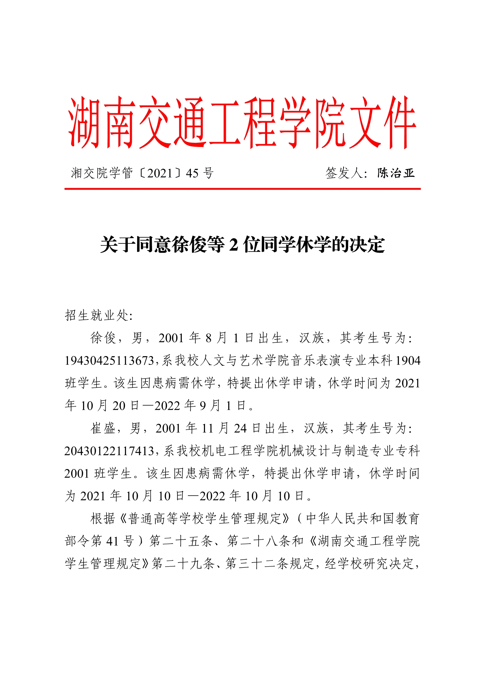 关于同意徐俊等2位同学休学的决定(湘交院学管〔2021〕45号)