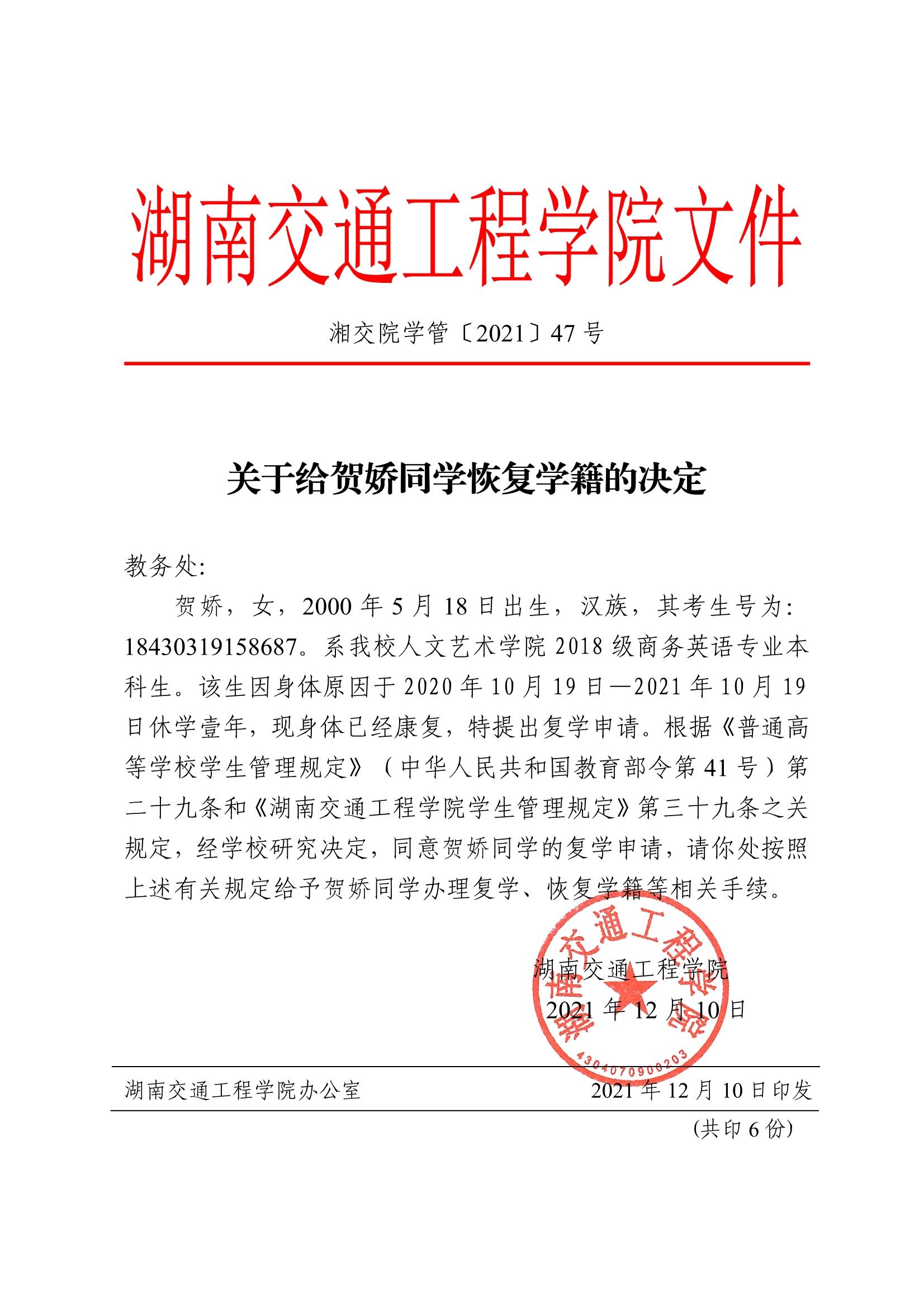 关于给贺娇同学恢复学籍的决定(湘交院学管〔2021〕47号)