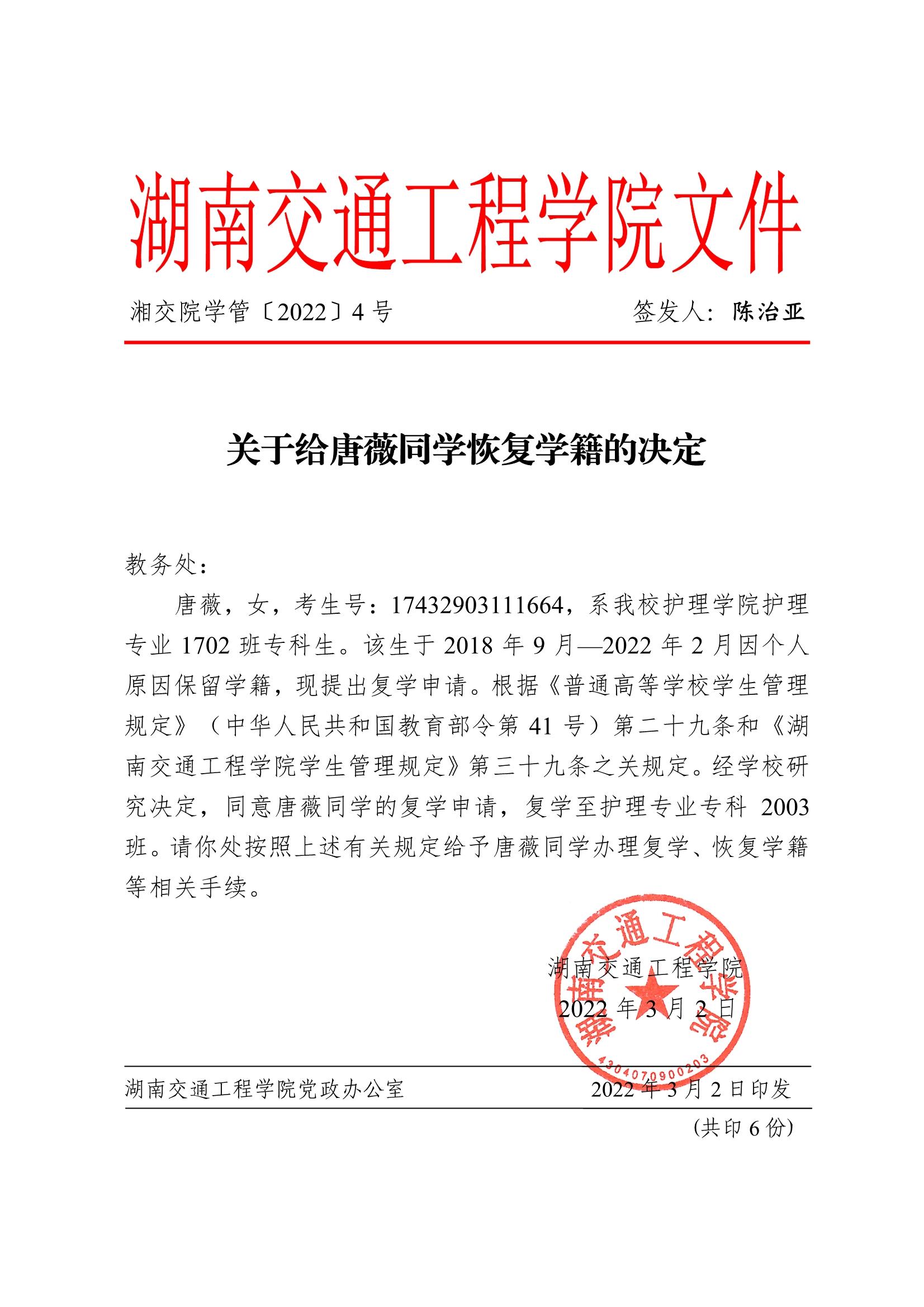 关于给唐薇同学恢复学籍的决定(湘交院学管〔2022〕4号)