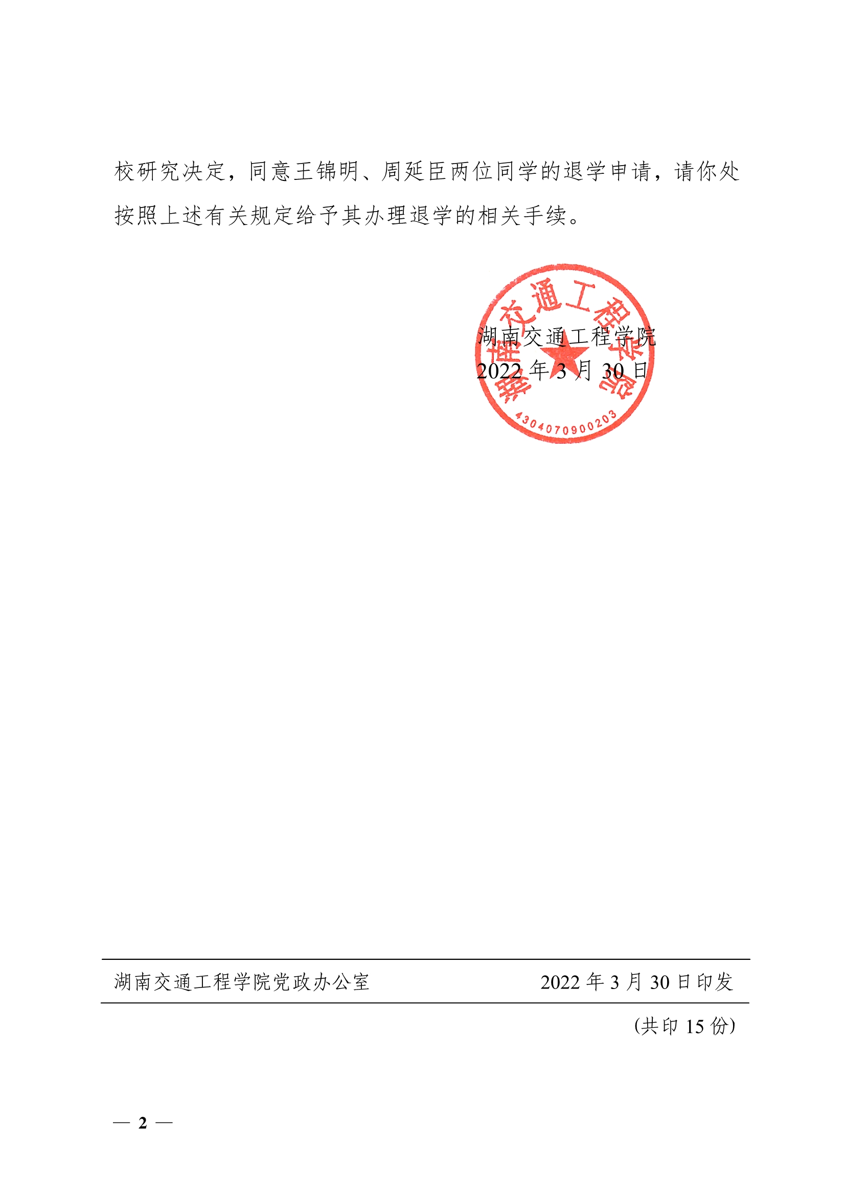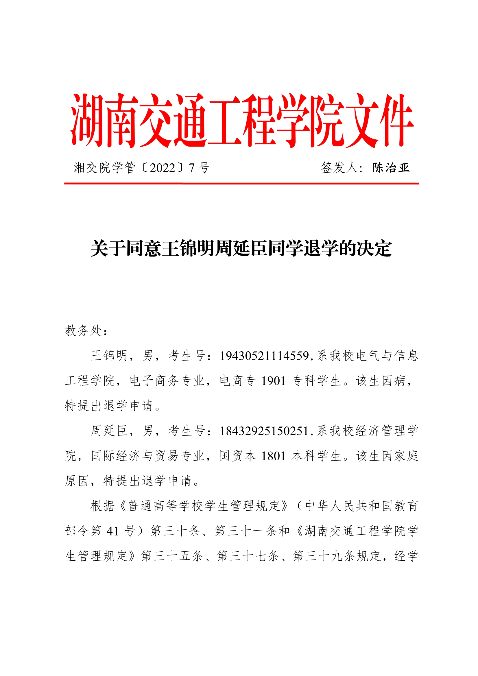关于同意王锦明周延臣同学退学的决定(湘交院学管〔2022〕7号)