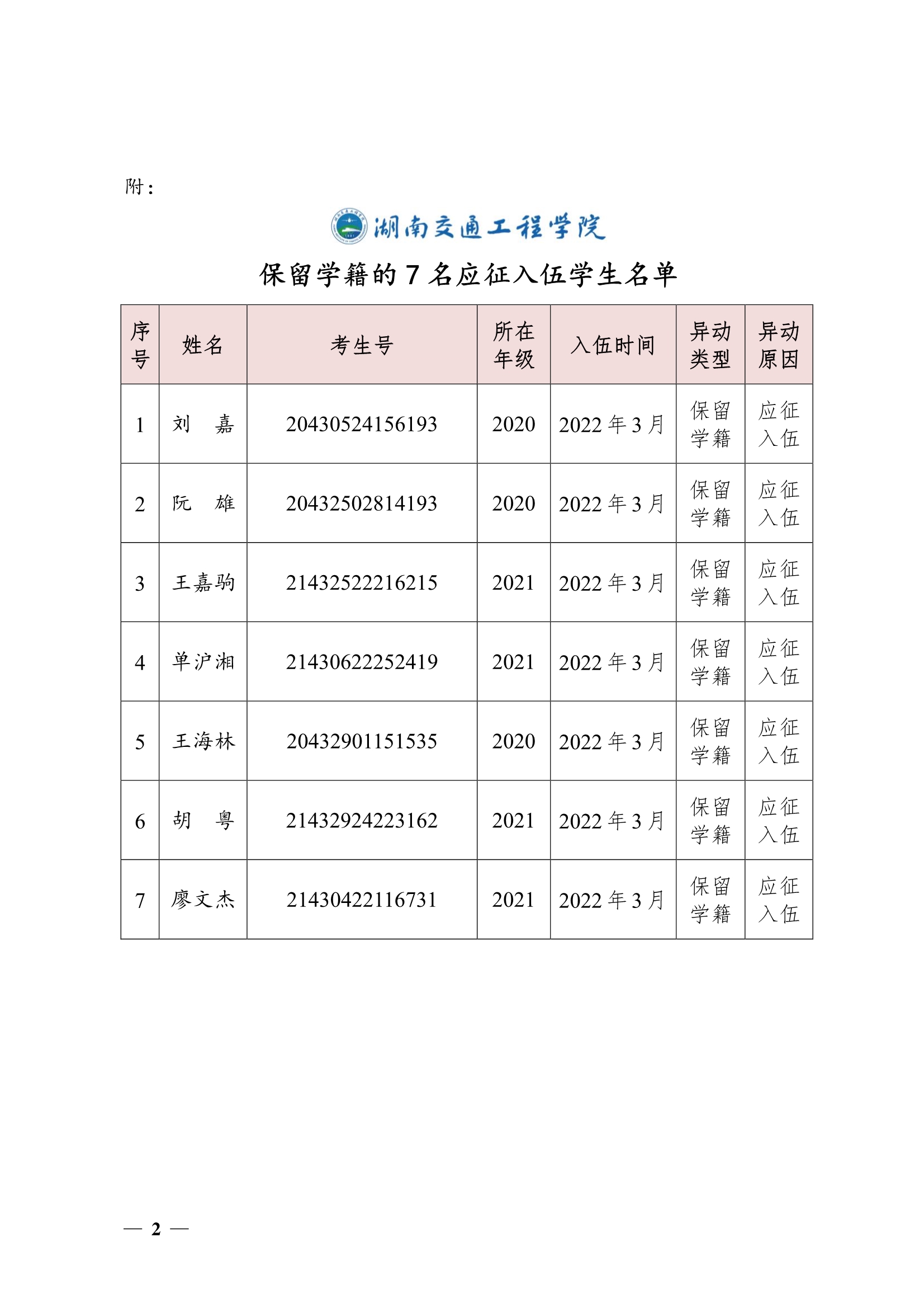 关于同意刘嘉等7名同学保留学籍的决定(湘交院学管〔2022〕11号)