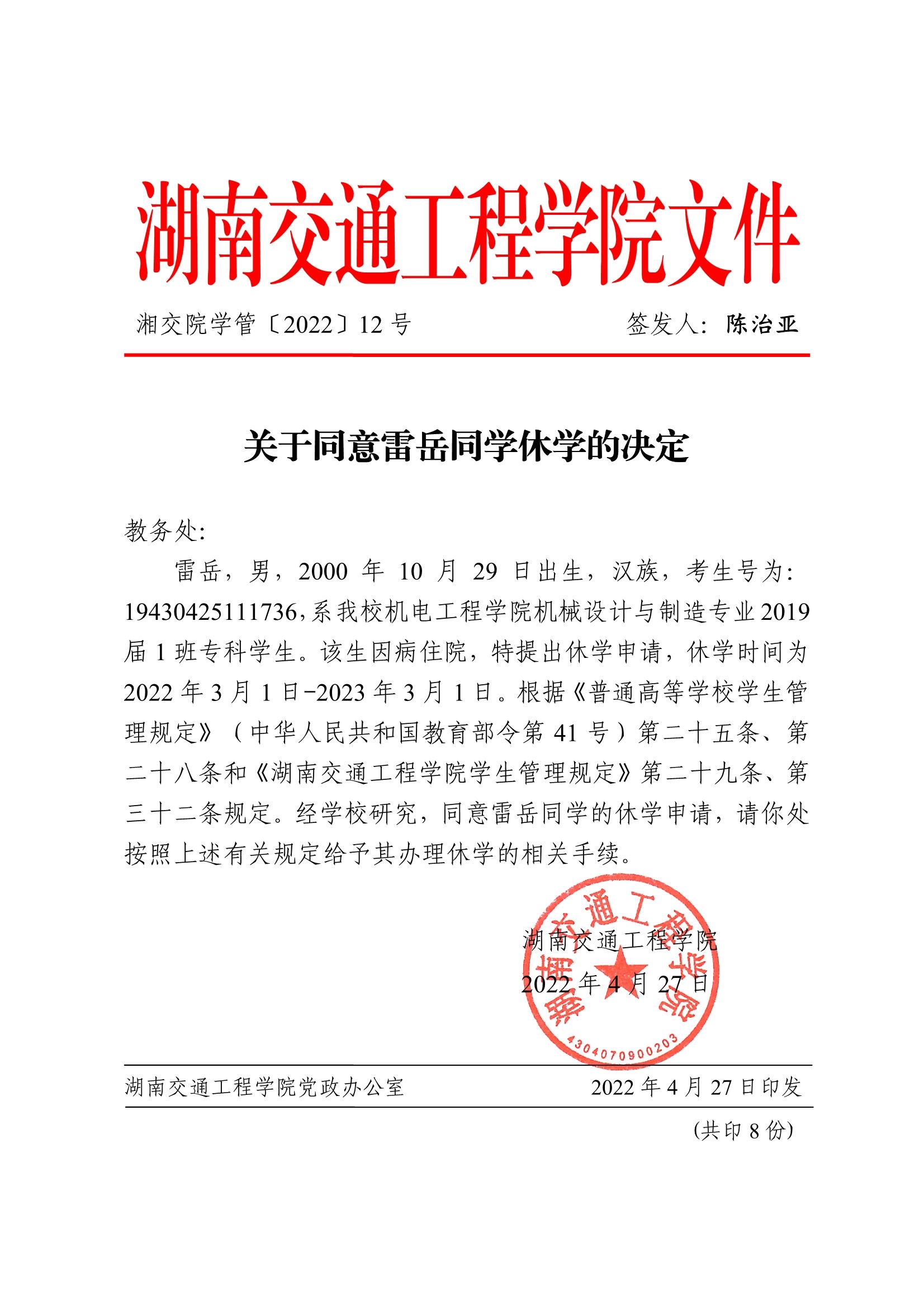 关于同意雷岳同学休学的决定(湘交院学管〔2022〕12号)