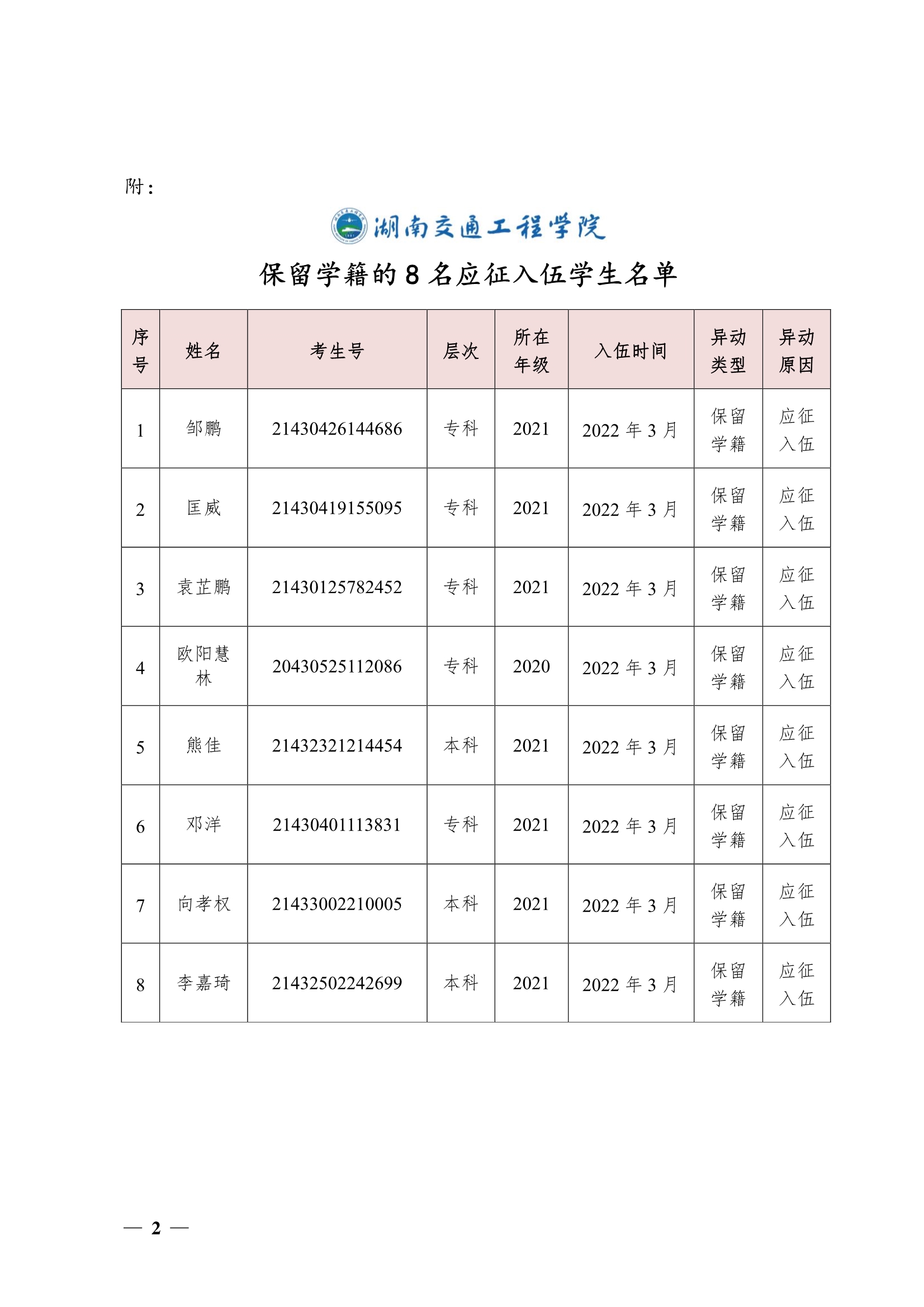 关于同意邹鹏等8名同学保留学籍的决定(湘交院学管〔2022〕16号)