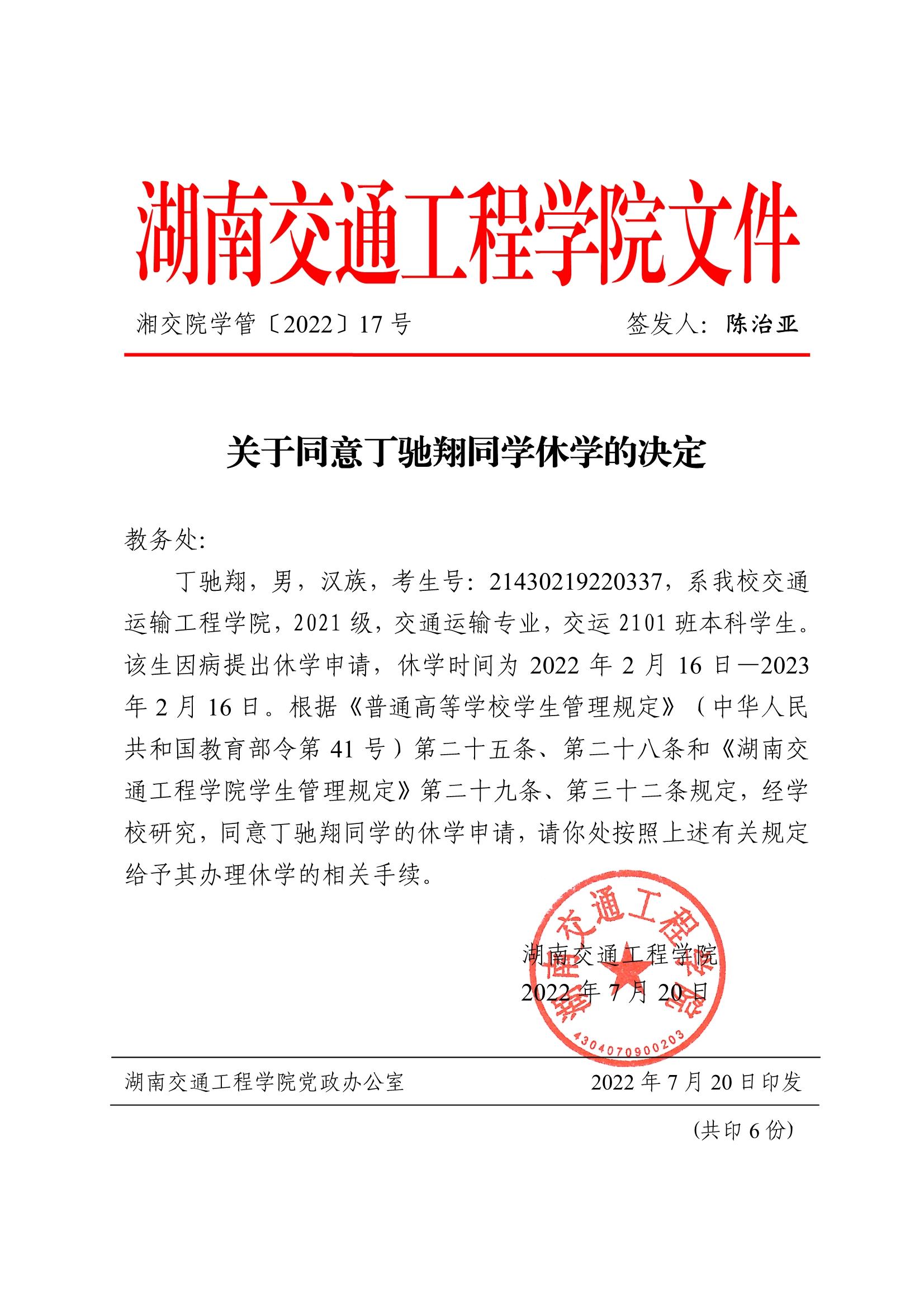 关于同意丁驰翔同学休学的决定(湘交院学管〔2022〕17号)