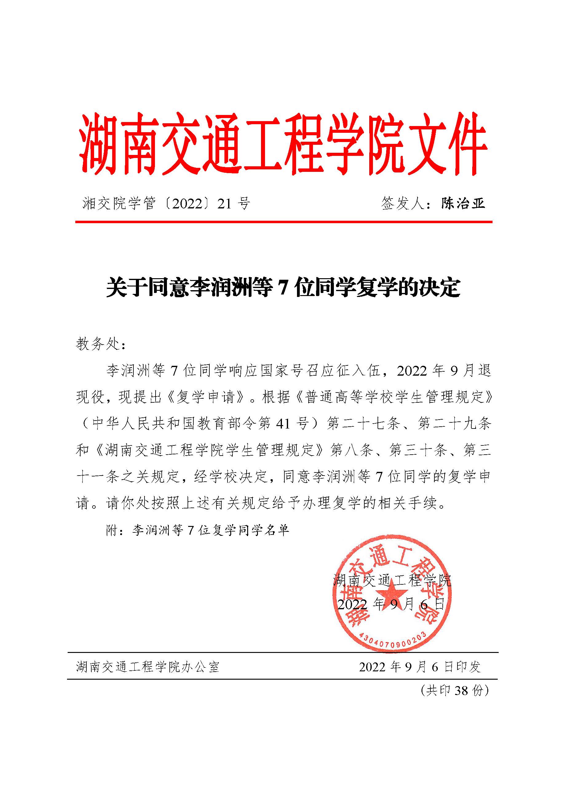关于同意李润洲等7位同学复学的决定(交院学管〔2022〕21号)