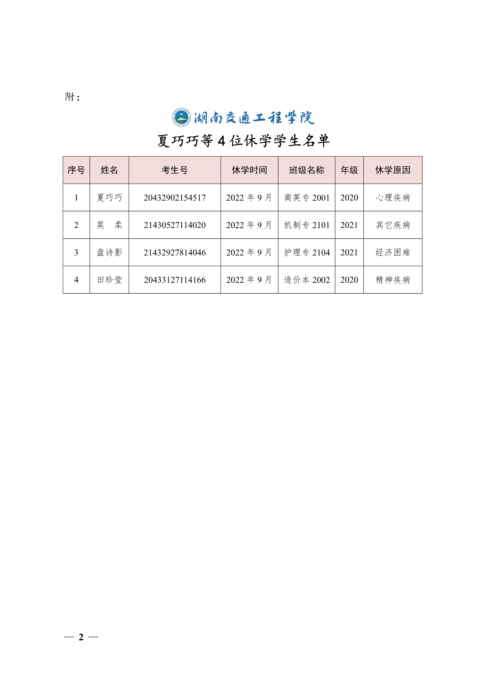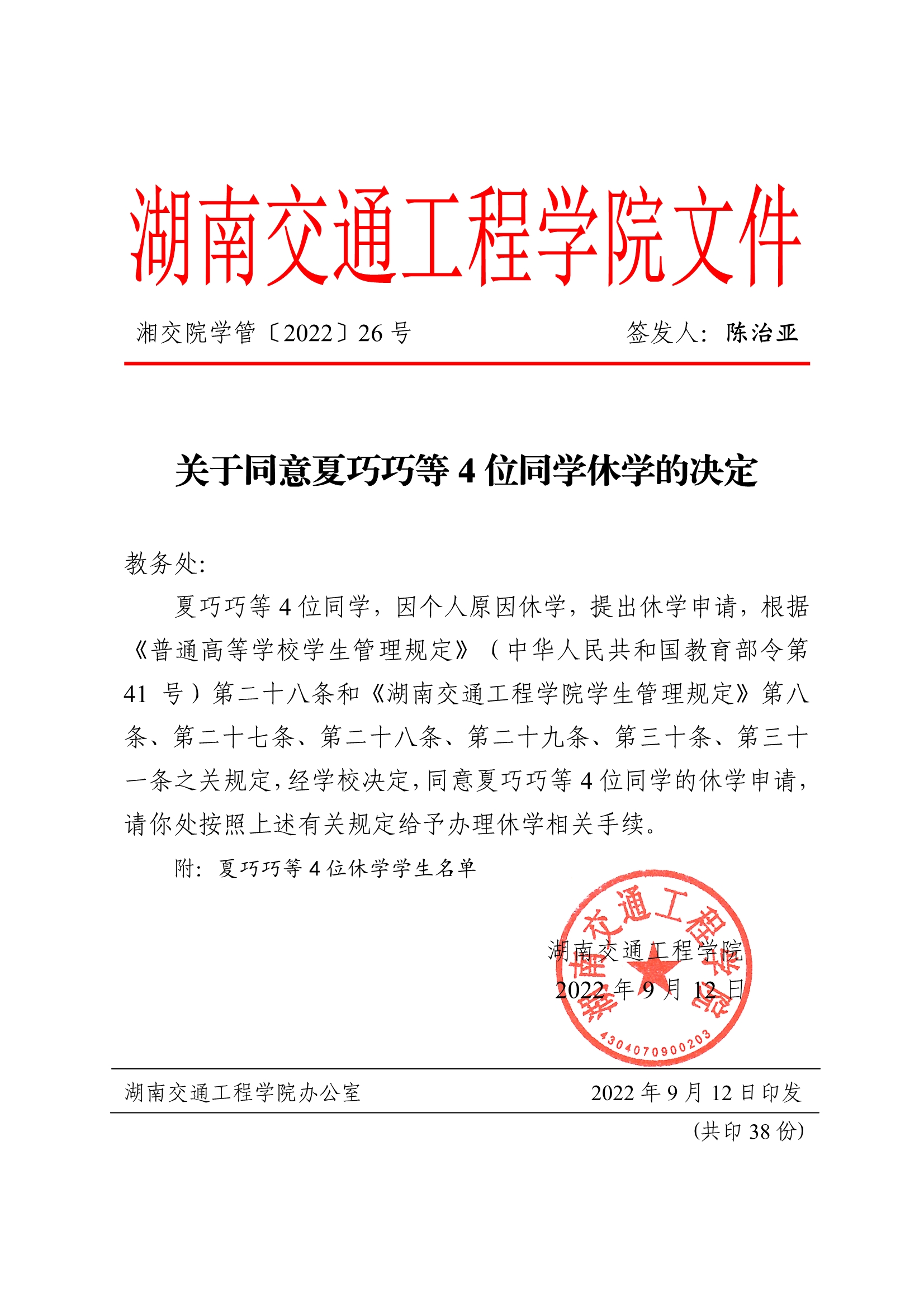 关于同意夏巧巧等4位同学休学的决定(湘交院学管〔2022〕26号)