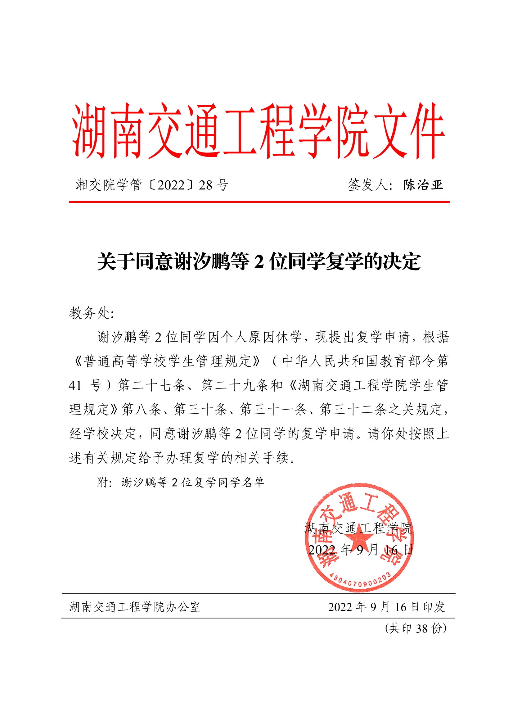 关于同意谢汐鹏等2位同学复学的决定(湘交院学管〔2022〕28号)