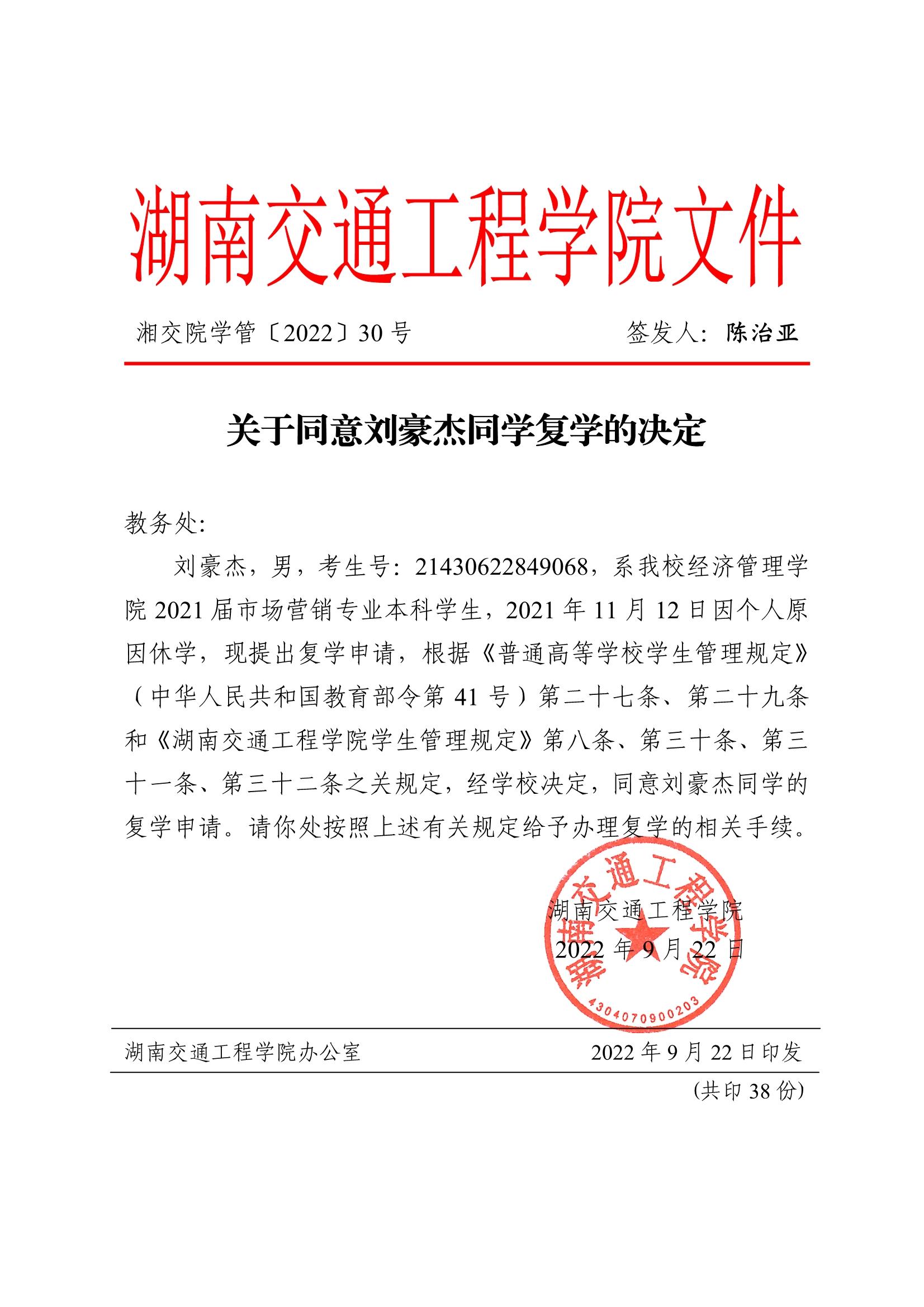 关于同意刘豪杰同学复学的决定(湘交院学管〔2022〕30号)