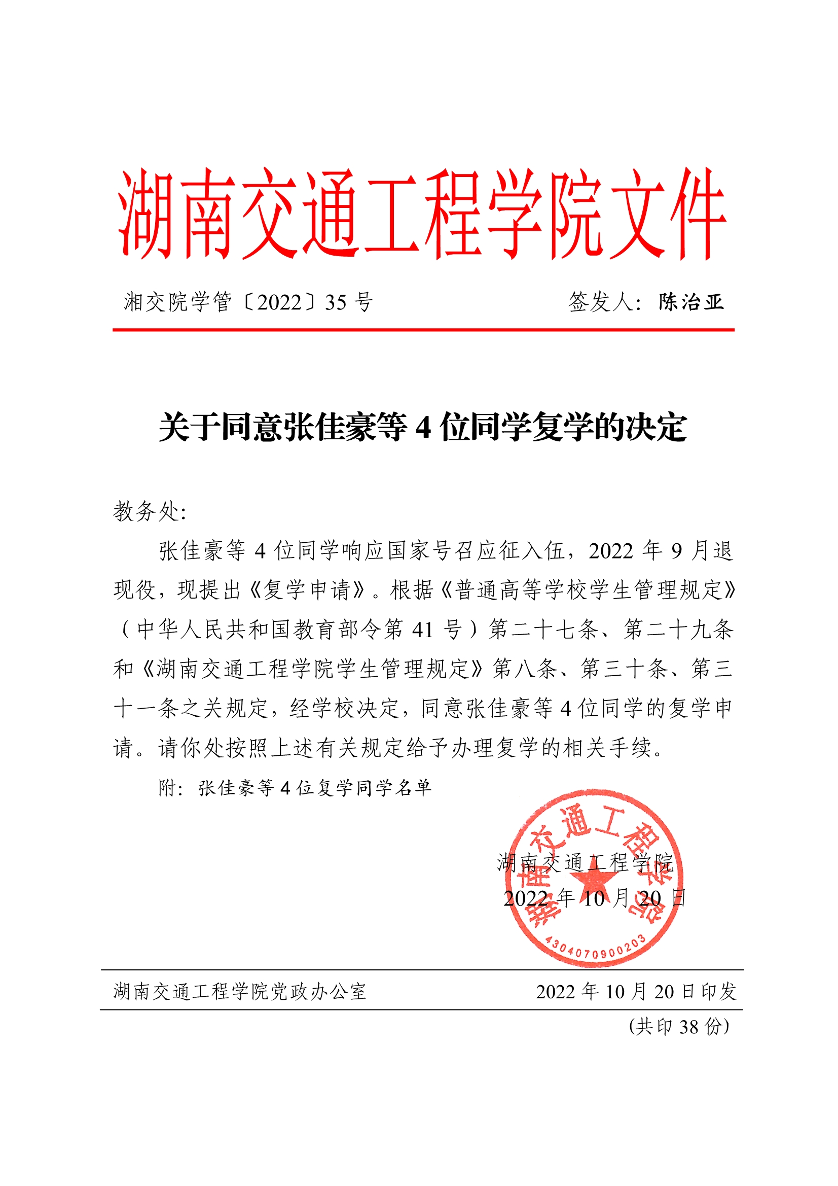 关于同意张佳豪等4位同学复学的决定(湘交院学管〔2022〕35号)