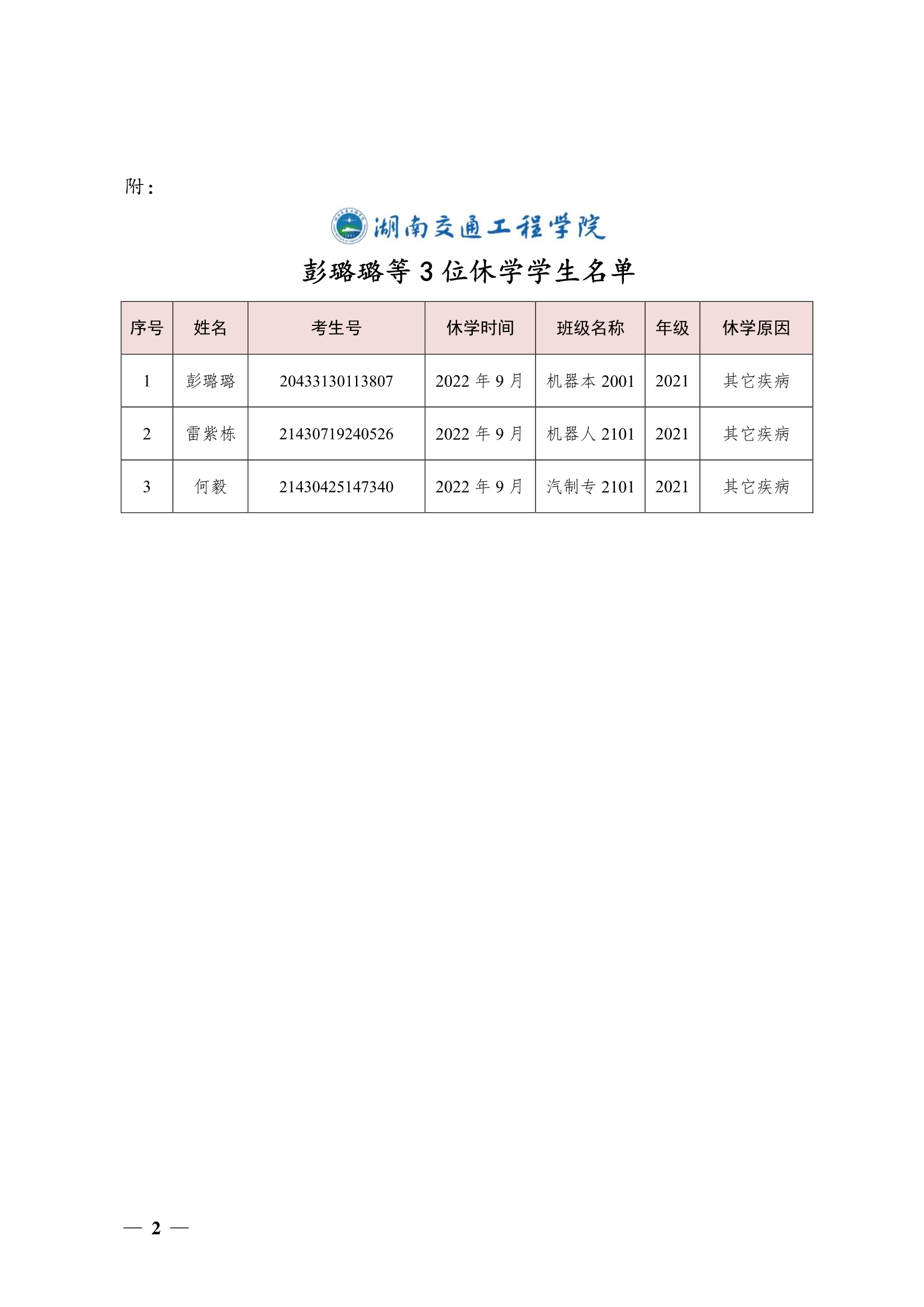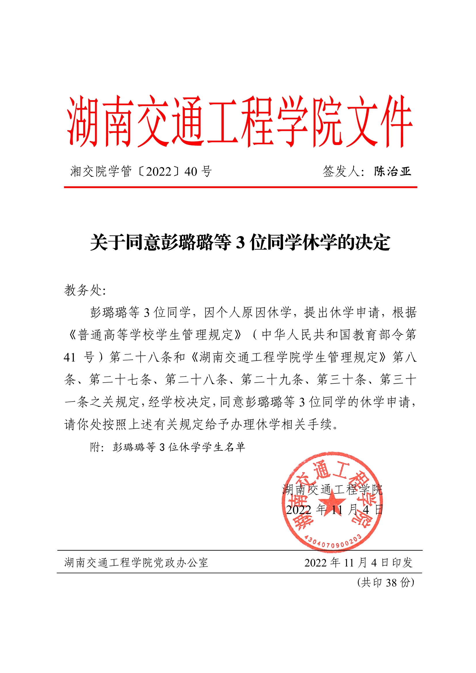 关于同意彭璐璐等3位同学休学的决定(湘交院学管〔2022〕40号)