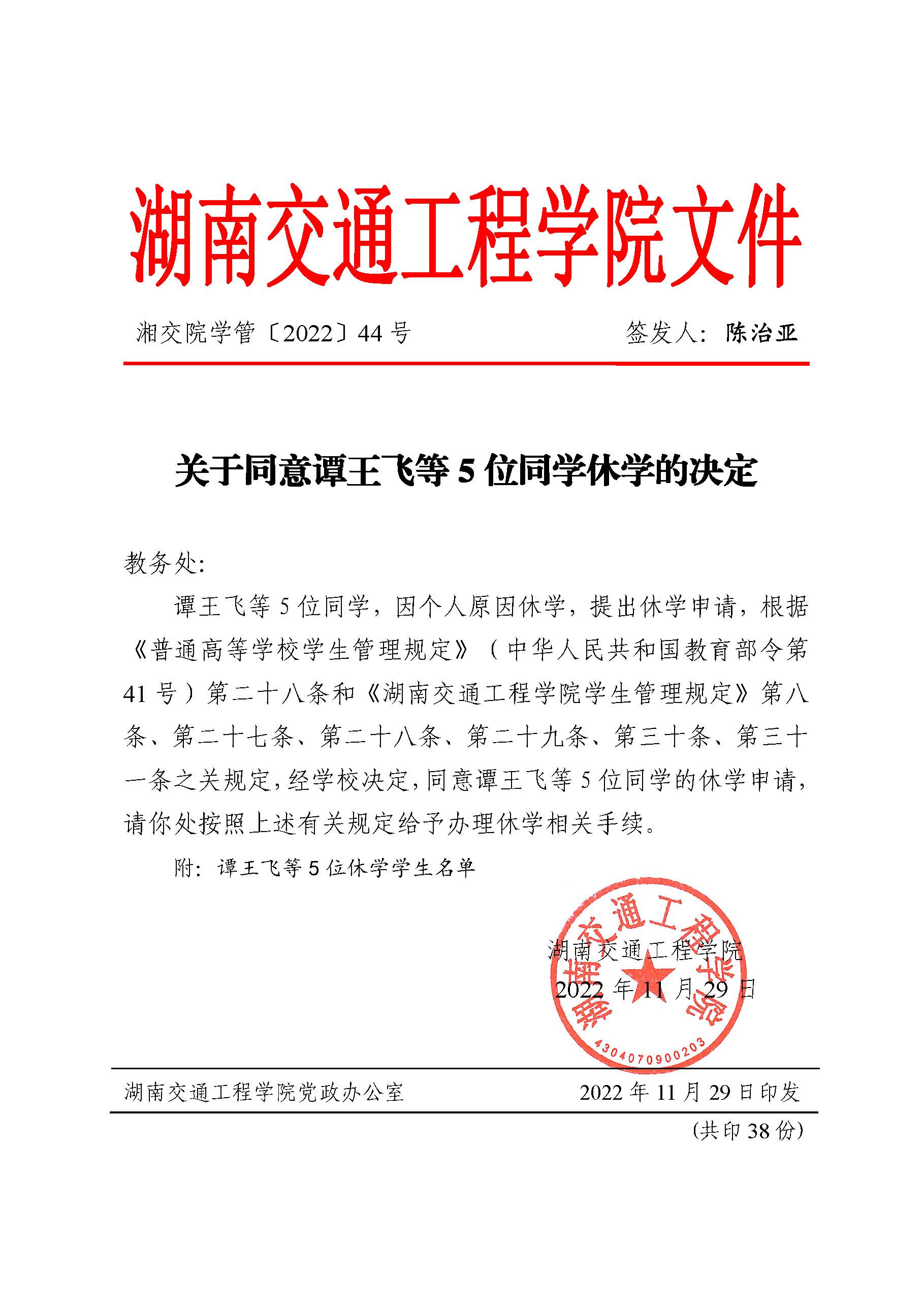 关于同意谭王飞等5位同学休学的决定(湘交院学管〔2022〕44号)