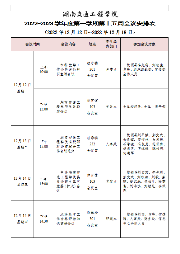 best365中国官方网站 2022-2023学年度第一学期第十五周会议安排表