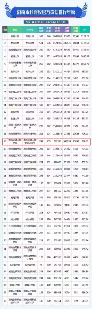 “湖南教育政务微信排行榜”每月由“湘微教育”独家发布,数据来源于腾讯微信公众平台。排行榜综合省内各高校官方微信公众号的发文数、阅读数、点赞数等数据信息,计算得出WCI得分,以此进行排序,是对高校微信公众号社会影响力和美誉度的全面评价。