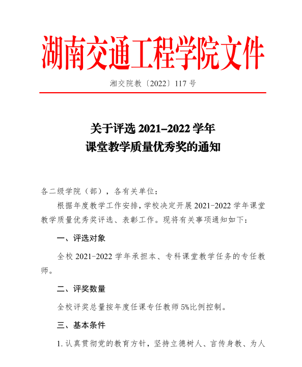 关于评选2021-2022学年课堂教学质量优秀奖的通知