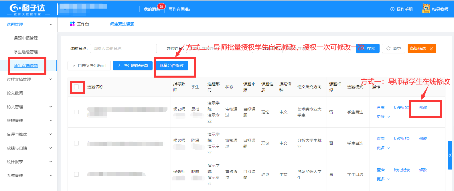 2、已双选课题修改