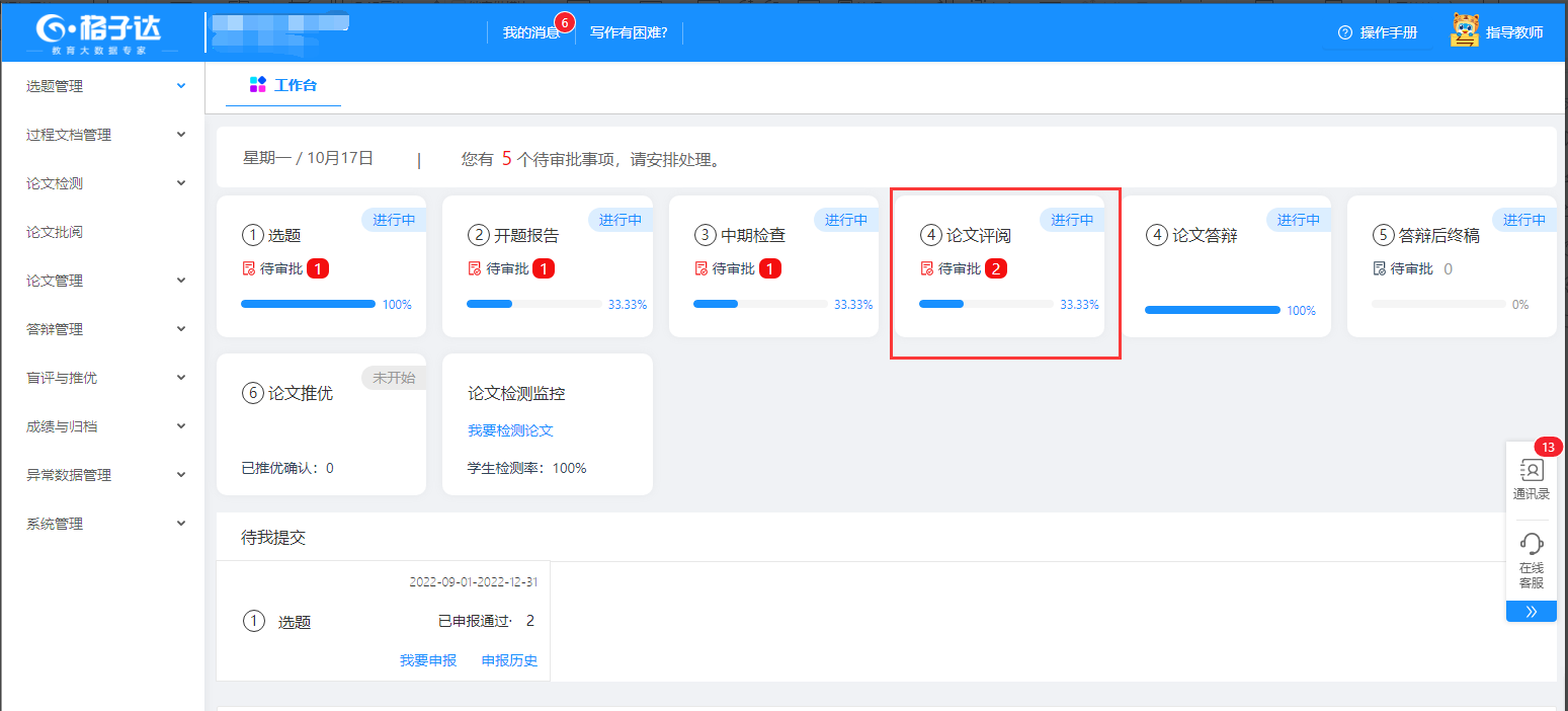 导师进入工作台,查看与审批学生提交的课题、开题报告、论文等。