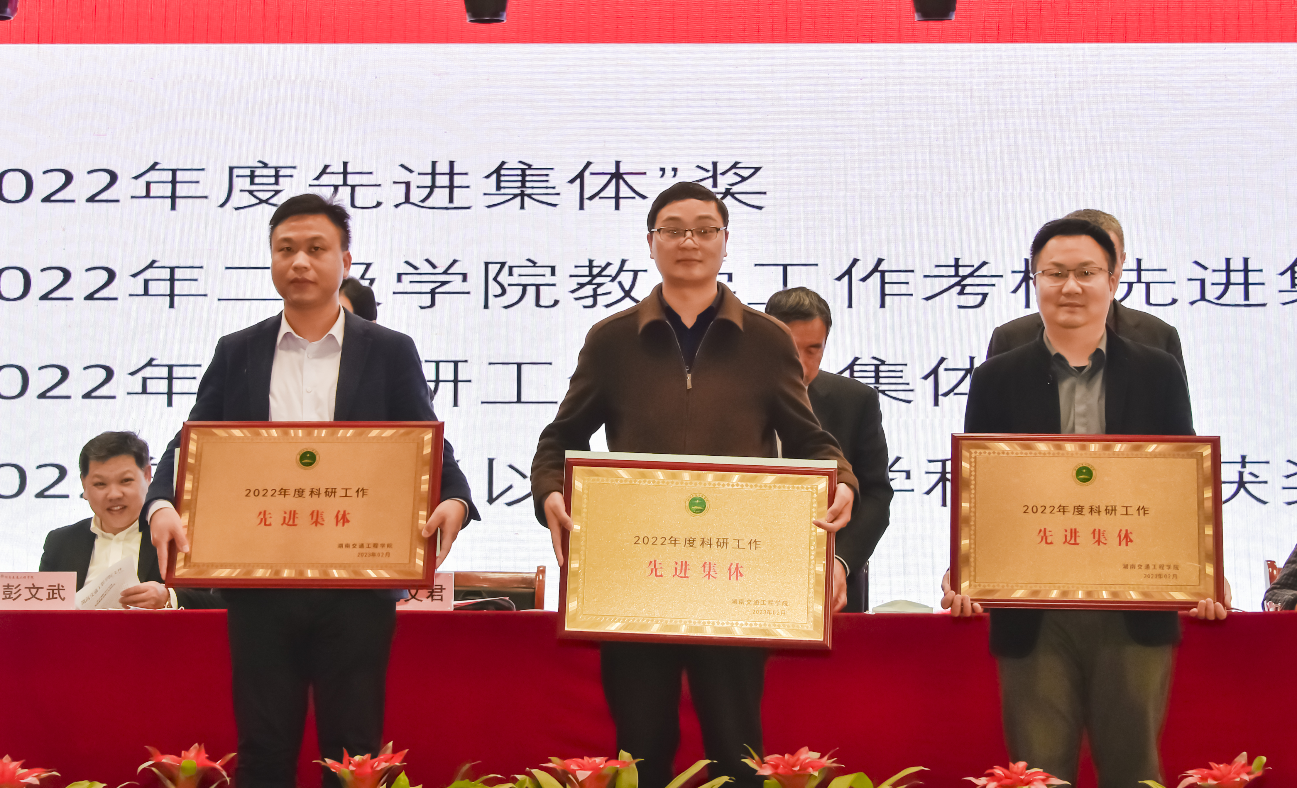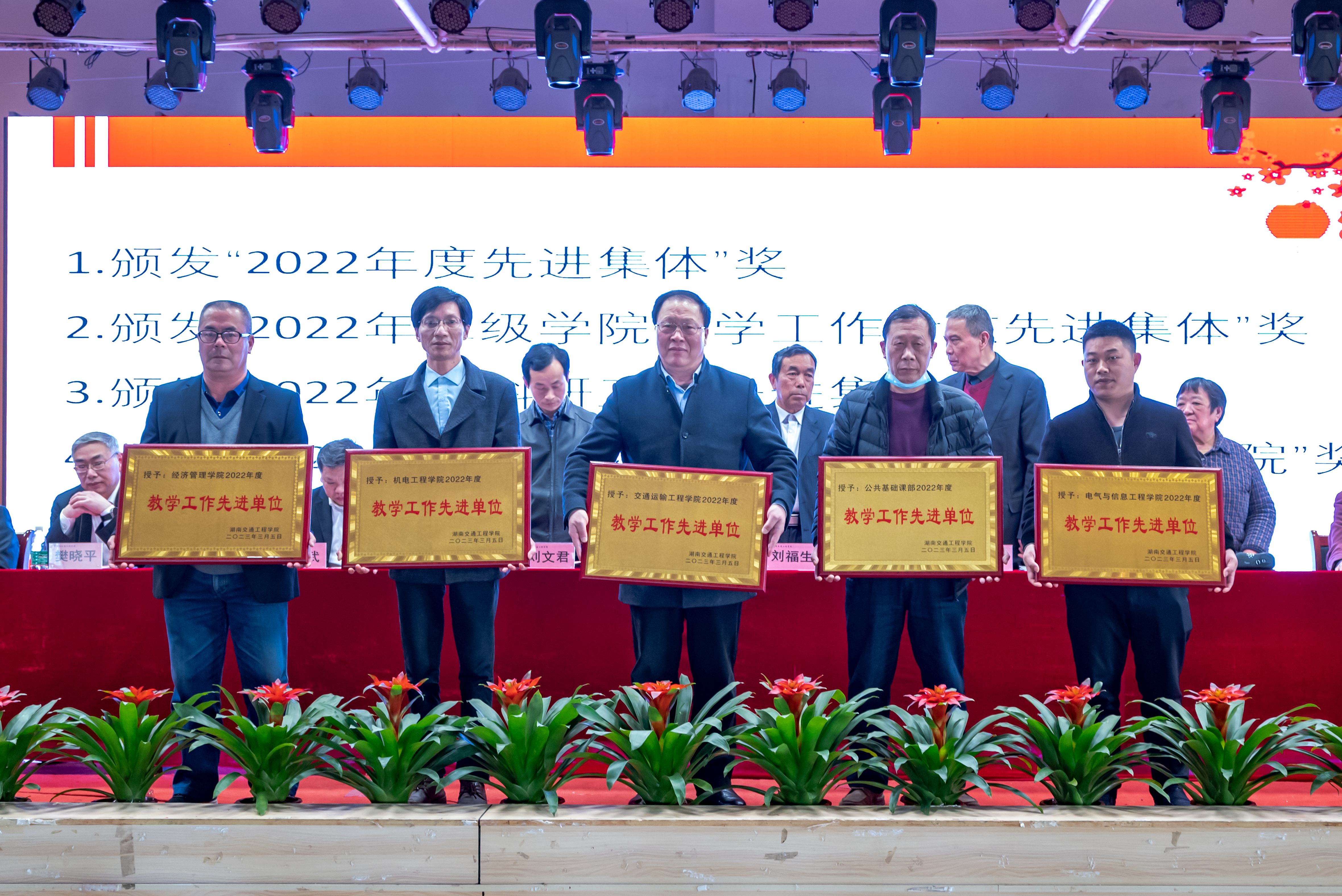 常务副校长彭文武宣读了六个表彰决定:《关于表彰 2022 年度先进集体、先进个人的决定》《2022年二级学院教学工作考核结果与奖励决定》《2022年教师教学科研业绩工作考核结果通报》《关于表彰2022年度科研工作先进集体、先进个人及优秀科研管理工作者的决定》《关于表彰2022年度省级以上学科竞赛获奖者的决定》《关于表彰 2022 年度省级教学比赛获奖者的决定》