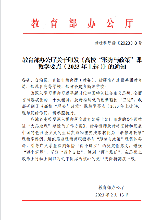 (转)教育部办公厅关于印发《高校“形势与政策”课 教学要点(2023 年上辑)》的通知