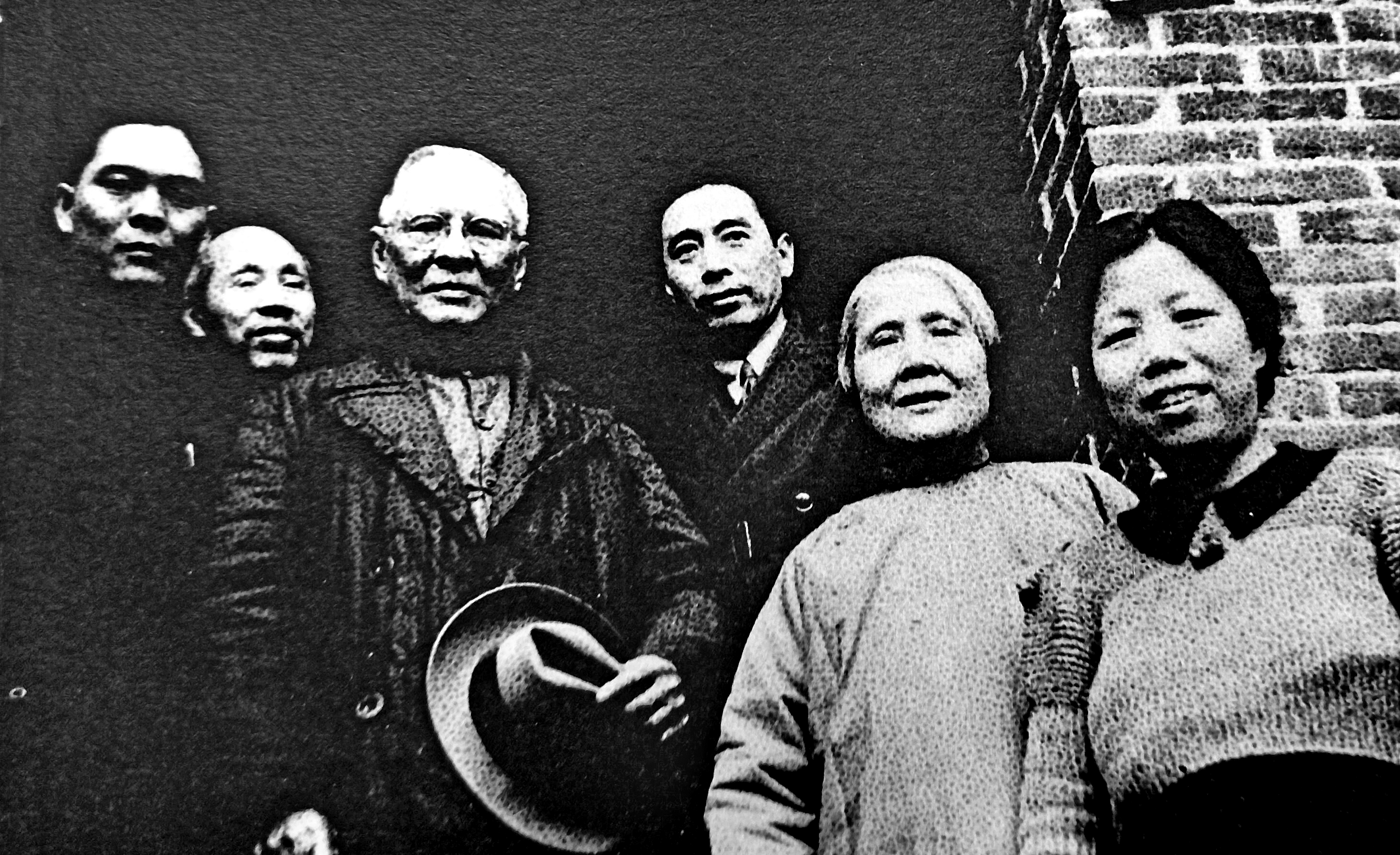 1941年冬,周恩来(左四)、董必武(左二)、邓颖超(右一)在重庆红岩村八路军驻渝办事处接待美国华侨领袖司徒美堂(左三)和黄兴夫人徐总汉(右二)时留影