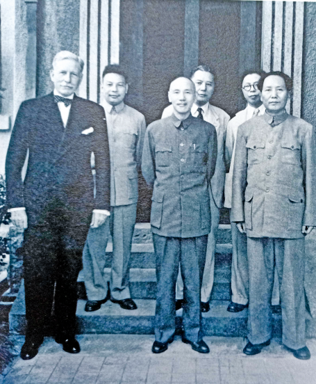 1945年8月,毛泽东到重庆后,同蒋介石进行了多次会谈。图为重庆谈判期间毛泽东同蒋介石等人的合影