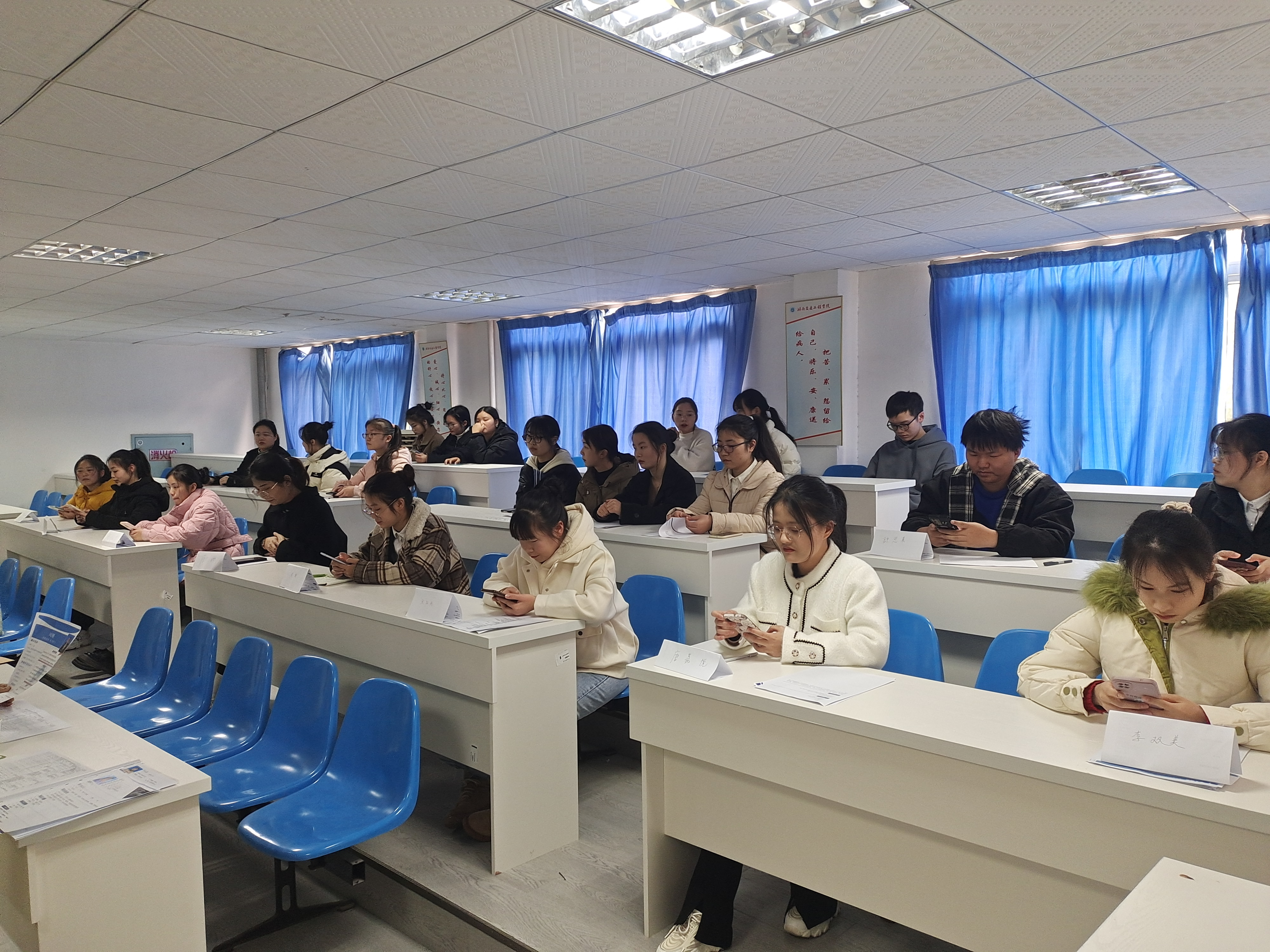 随后面试选拔会正式开始,实习生面试选拔工作共分两个环节,包括理论知识考核和面授考核,考试前,参加面试的同学们依次向面试官递交自己的简历并介绍自己,考试环节中,同学们认真答题,在规定的时间内完成答卷。在面授考核的环节中。我系学生们准备充分,发挥稳定,在回答面试官提出的问题的同时突出自己专业知识方面的优势,巧妙地让面试官更深入的了解自身情况。最后在面试官们专业的点评和同学们认真的发言中结束了实习面试。