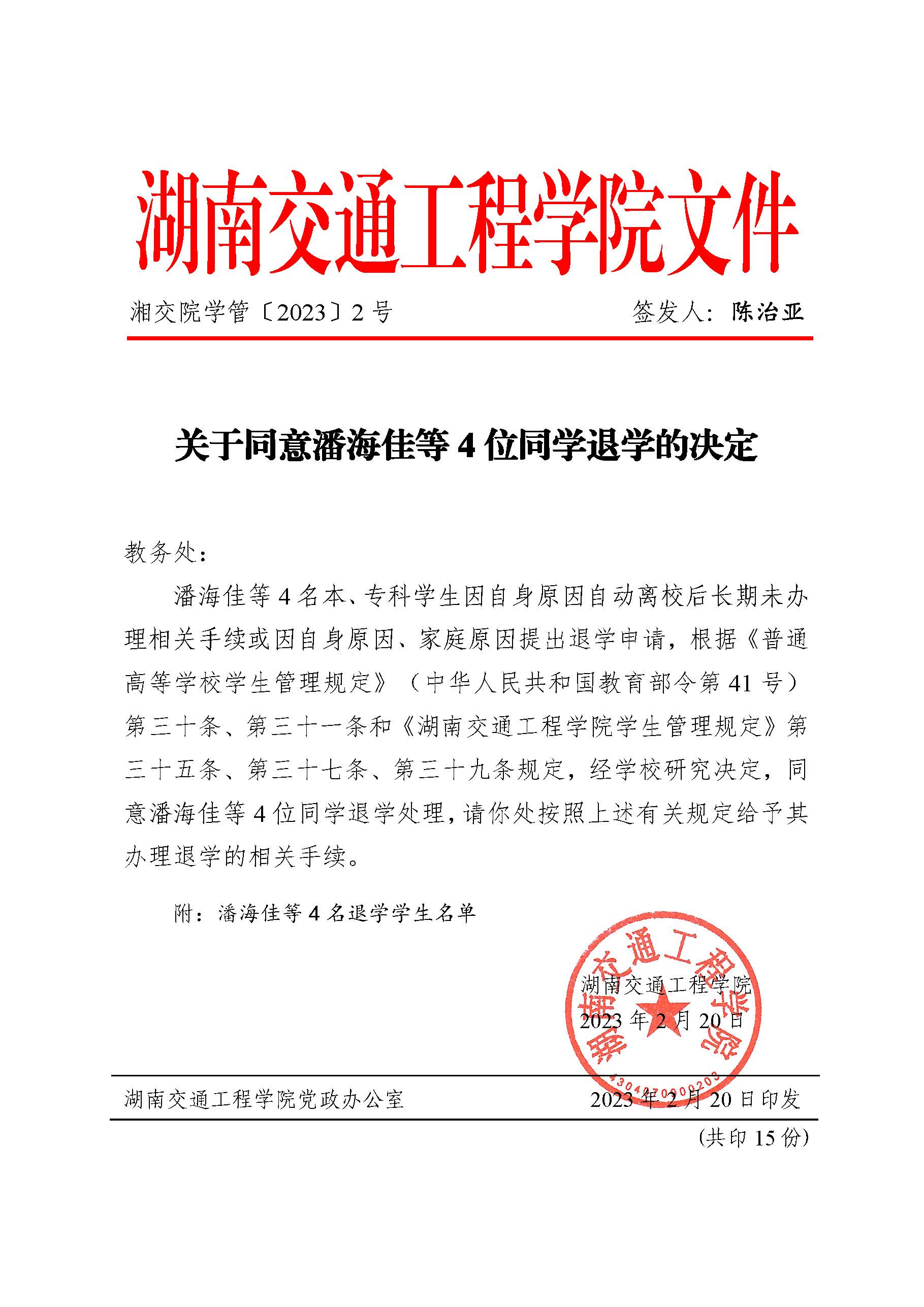 关于同意潘海佳等4位同学退学的决定(湘交院学管〔2023〕2号)