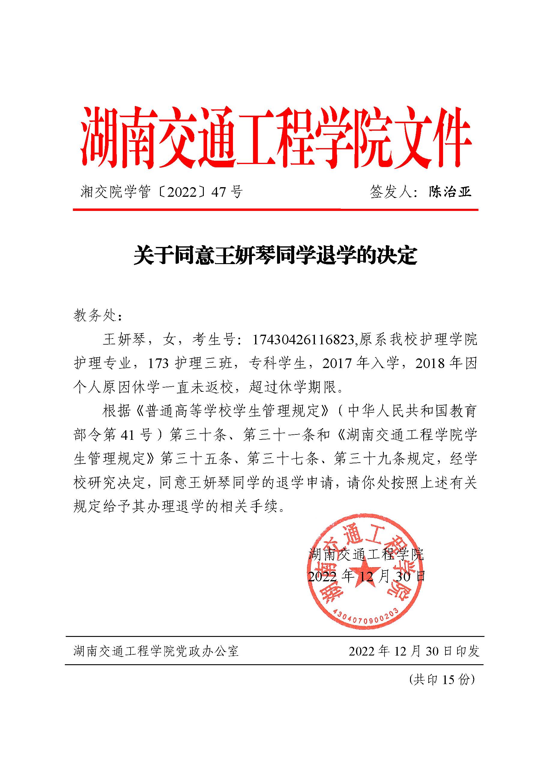 关于同意王妍琴同学退学的决定(湘交院学管〔2022〕47号)