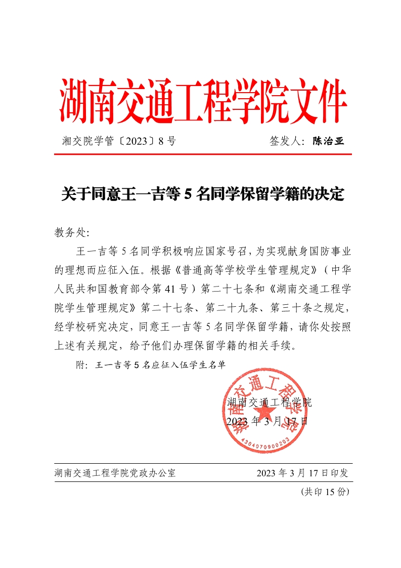 关于同意王一吉等5名同学保留学籍的决定(湘交院学管〔2023〕8号)