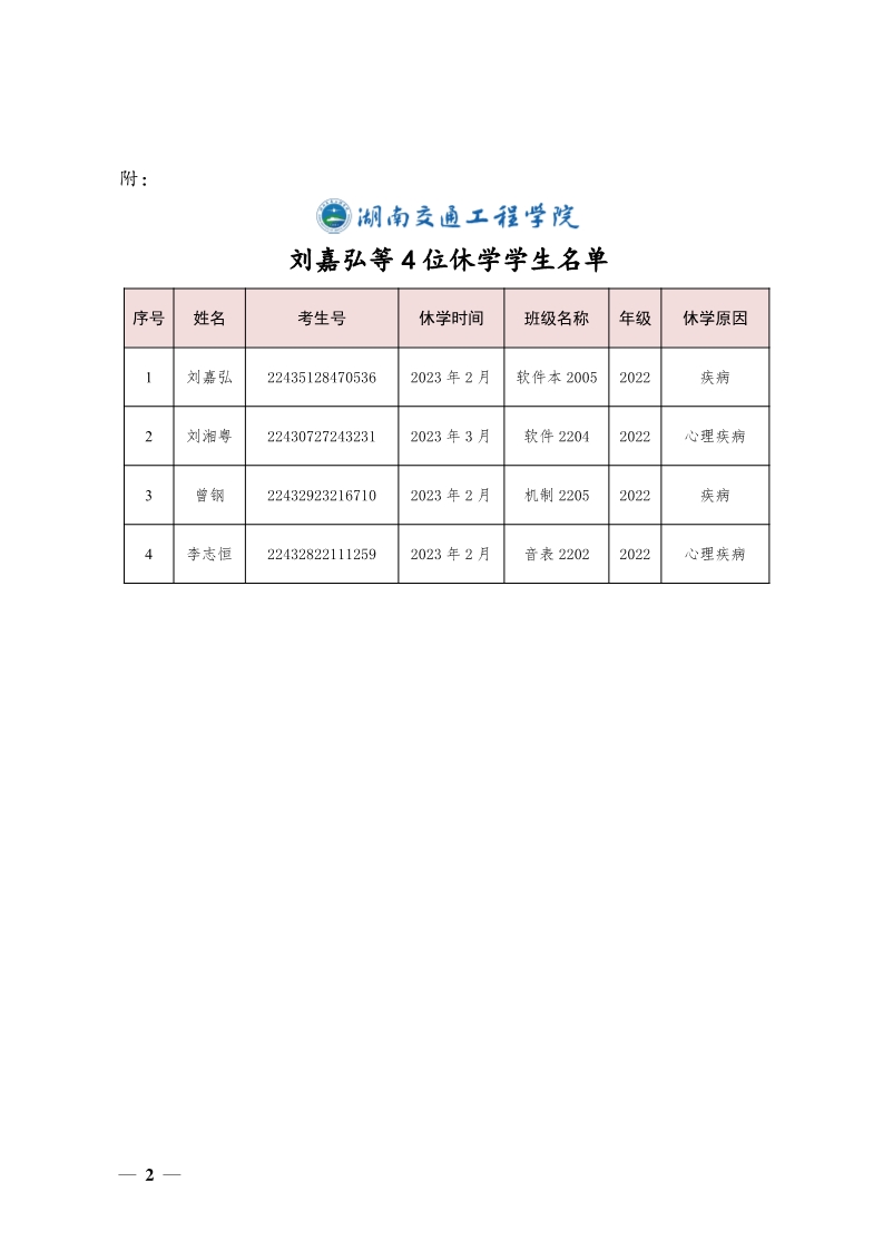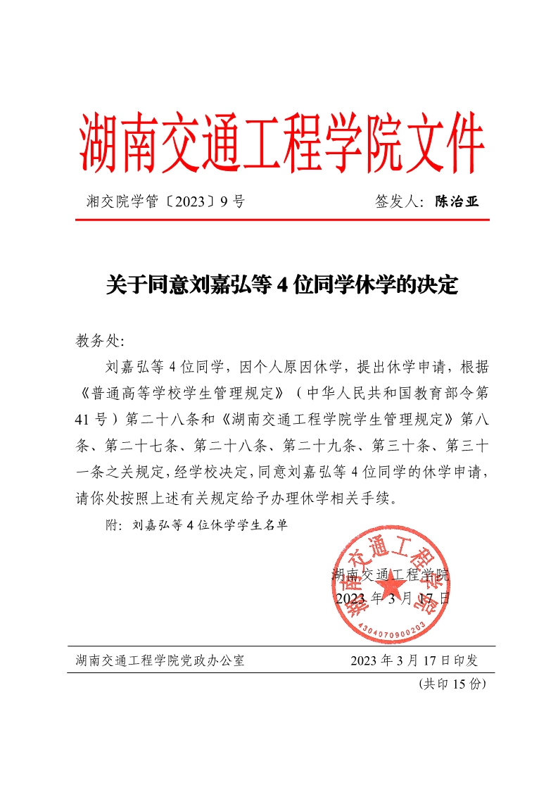关于同意刘嘉弘等4位同学休学的决定(湘交院学管〔2023〕9号)