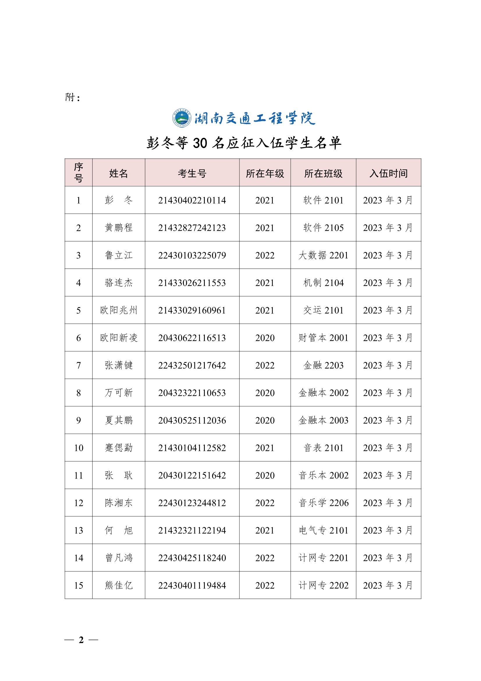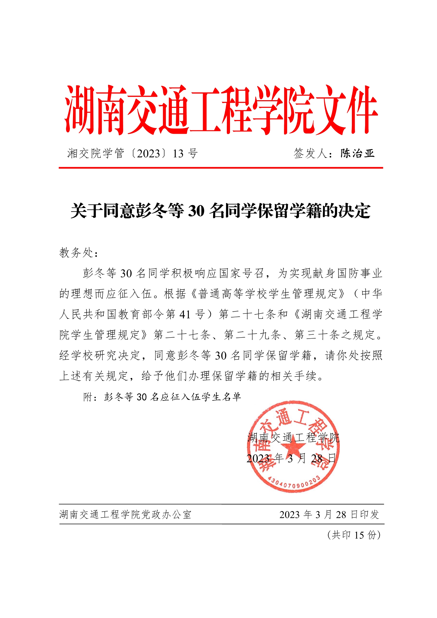 关于同意彭冬等30名同学保留学籍的决定(湘交院学管〔2023〕13号)